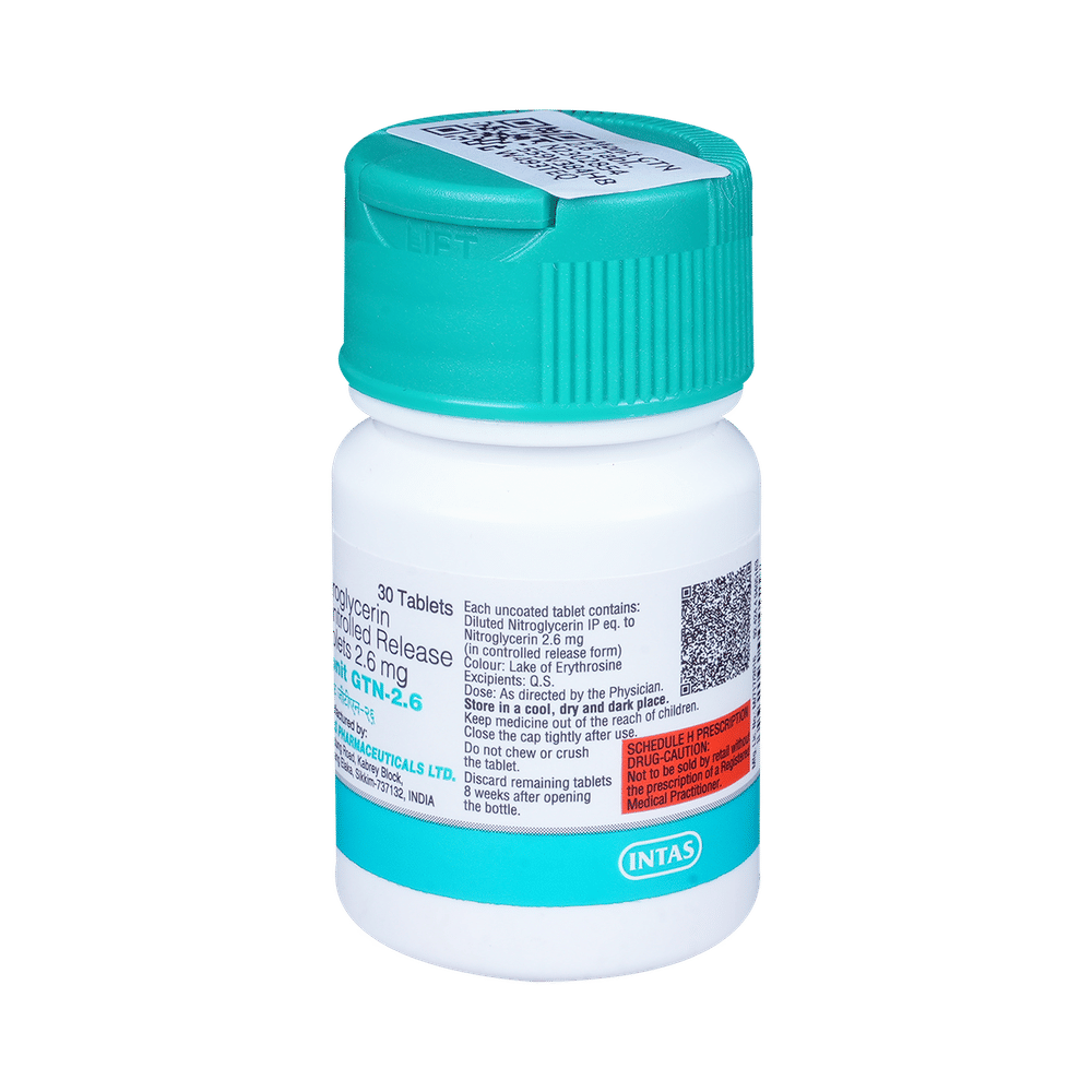 Monit GTN 2.6 Tablet CR is used to treat and prevent heart-related chest pain (angina). Angina occurs when the heart muscle is not getting enough blood. This medicine works by relaxing and widening blood vessels so blood can flow more easily to the heart. Monit GTN 2.6 Tablet CR should be taken in the dose and duration as advised by your doctor. It may be taken with or without food, preferably at a fixed time each day. Do not consume more than the recommended dose, as this may have harmful effects on your body. You can develop tolerance to this medicine over time, which means that the same dose becomes less effective. You have to stick to a really specific dosing schedule to prevent this from happening.The most common side effect of this medicine is a headache which may be severe. This can sometimes be helped by drinking plenty of fluids and avoiding alcohol. You may also experience lightheadedness, which could increase your risk of having a fall. There are other, rarer side effects, some of them serious. Ask your doctor and read the leaflet which comes with the medicine to make sure you are keeping safe.Do not use this medicine if you are taking medicines to treat high blood pressure in your lungs (pulmonary hypertension), erectile dysfunction or if you have anemia or glaucoma (increased pressure inside the eye). Always tell your doctor what other health conditions you have and what other medicines you are taking. It is best not to drink alcohol with this medicine as it increases some of the side effects. If you are affected by dizziness, avoid driving. If you are pregnant, planning to become pregnant, or breastfeeding, ask your doctor before taking this medicine.