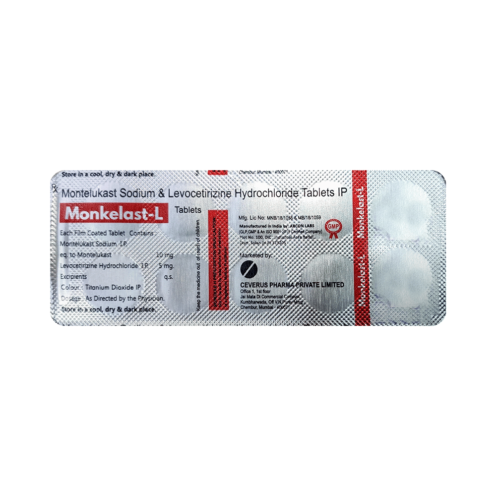 In Treatment of Allergic skin conditionsMonkelast-L Tablet is effective in treating allergic skin conditions with inflammation and itching. It reduces the actions of chemicals in the body that cause inflammation of the skin. When used correctly it is a safe and effective treatment. It reduces the redness, rash, pain or itchiness caused by your skin’s reaction to an irritant. It thus improves your self-esteem and confidence as your appearance changes. Keep taking it for as long as it is prescribed to get the full benefits.In Treatment of Sneezing and runny nose due to allergiesMonkelast-L Tablet is a combination medicine that provides relief from symptoms such as blocked or runny nose, sneezing and itchy or watery eyes. This will make it easier for you to go about your daily activities. It rarely has any serious side effects and you may only need to take it on days you have symptoms. If you are taking it to prevent getting symptoms you should use it regularly to get the most benefit.In Treatment of Hay feverHay fever, also called allergic rhinitis, causes cold-like signs and symptoms, such as a runny nose, itchy eyes, congestion, sneezing and sinus pressure. The only difference is that in hay fever, these symptoms are not produced due to a virus but are simply allergic responses of our body to allergens (allergy causing agents such as pollen). Monkelast-L Tablet is used to provide relief from these symptoms of hay fever. It works by blocking the release of the chemical substance responsible for producing such allergy symptoms. Monkelast-L Tablet is a safe medicine which helps treat hay fever and makes us feel at ease.show moreshow less