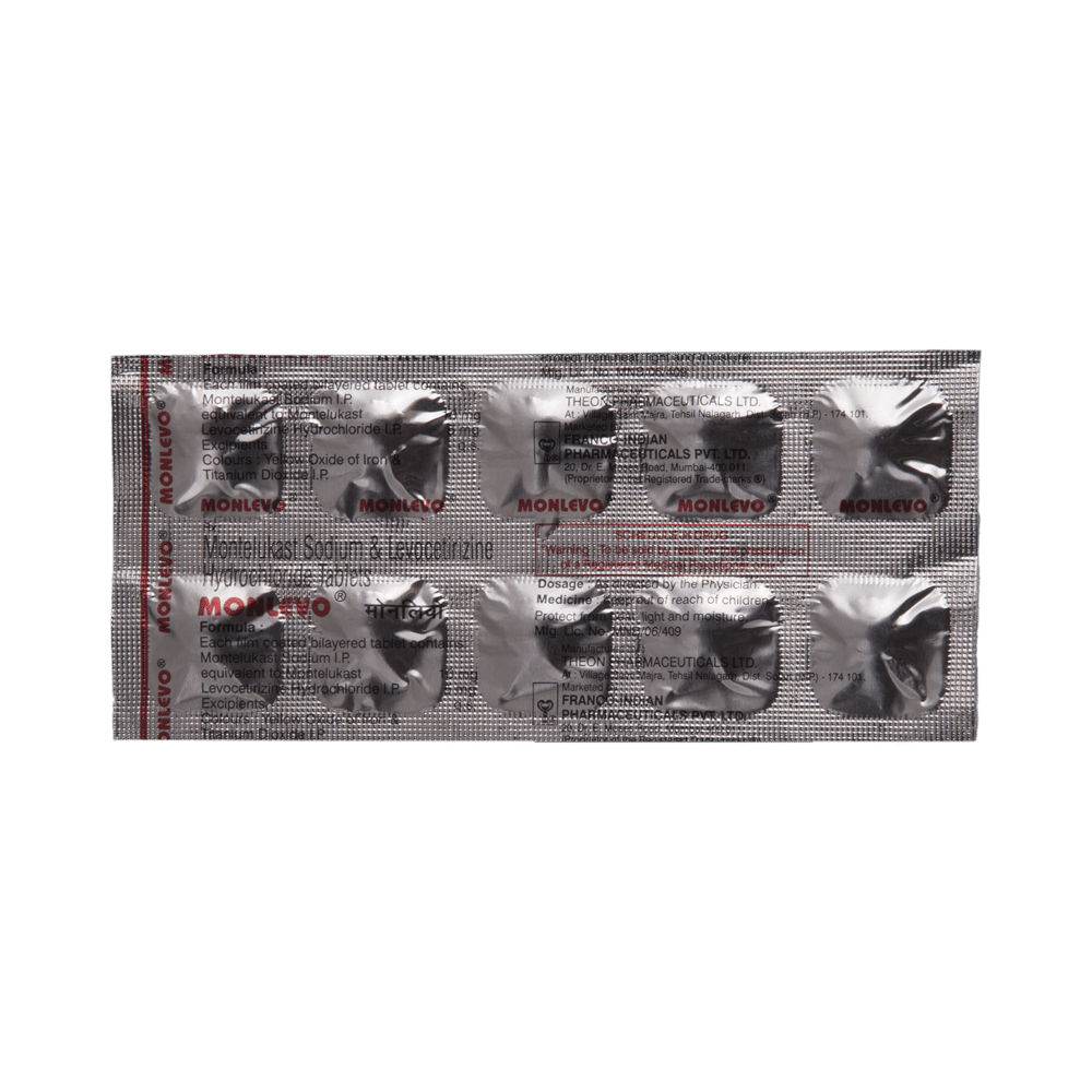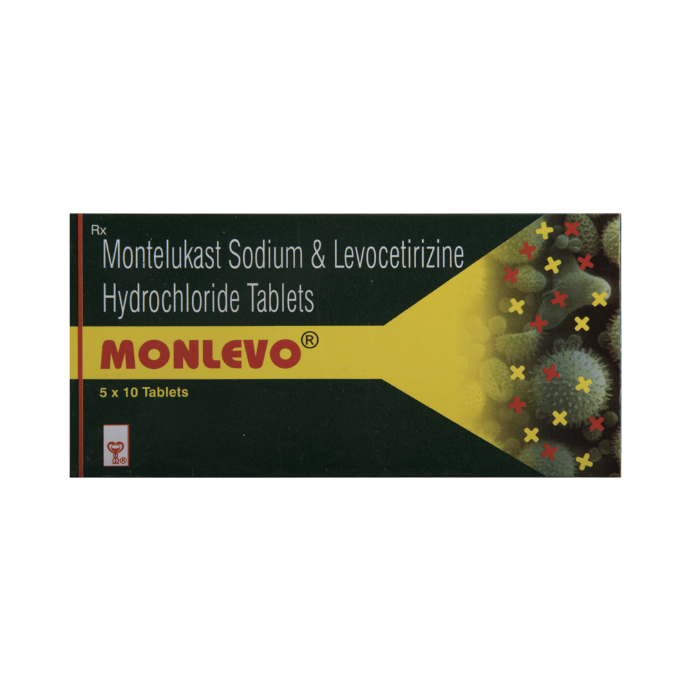 Monlevo Tablet is a combination medicine used in the treatment of allergic symptoms such as runny nose, stuffy nose, sneezing, itching, swelling, watery eyes and congestion or stuffiness. It also reduces inflammation in the airways and make breathing easier. Monlevo Tablet is taken with or without food in a dose and duration as advised by the doctor. The dose you are given will depend on your condition and how you respond to the medicine. You should keep taking this medicine for as long as your doctor recommends. If you stop treatment too early your symptoms may come back and your condition may worsen. Let your healthcare team know about all other medications you are taking as some may affect, or be affected by this medicine.The most common side effects are nausea, diarrhea, vomiting, dryness in the mouth, headache, skin rash, flu-like symptoms, and fatigue. Most of these are temporary and usually resolve with time. Contact your doctor straight away if you are at all concerned about any of these side effects. This medicine may cause dizziness and sleepiness, so do not drive or do anything that requires mental focus until you know how this medicine affects you. Avoid drinking alcohol while taking this medicine as it can worsen your sleepiness.Never support self-medication or recommend your medicine to another person. It is beneficial to have plenty of fluids while taking this medication. Before you start taking this medicine it is important to inform your doctor if you are suffering from kidney disease.