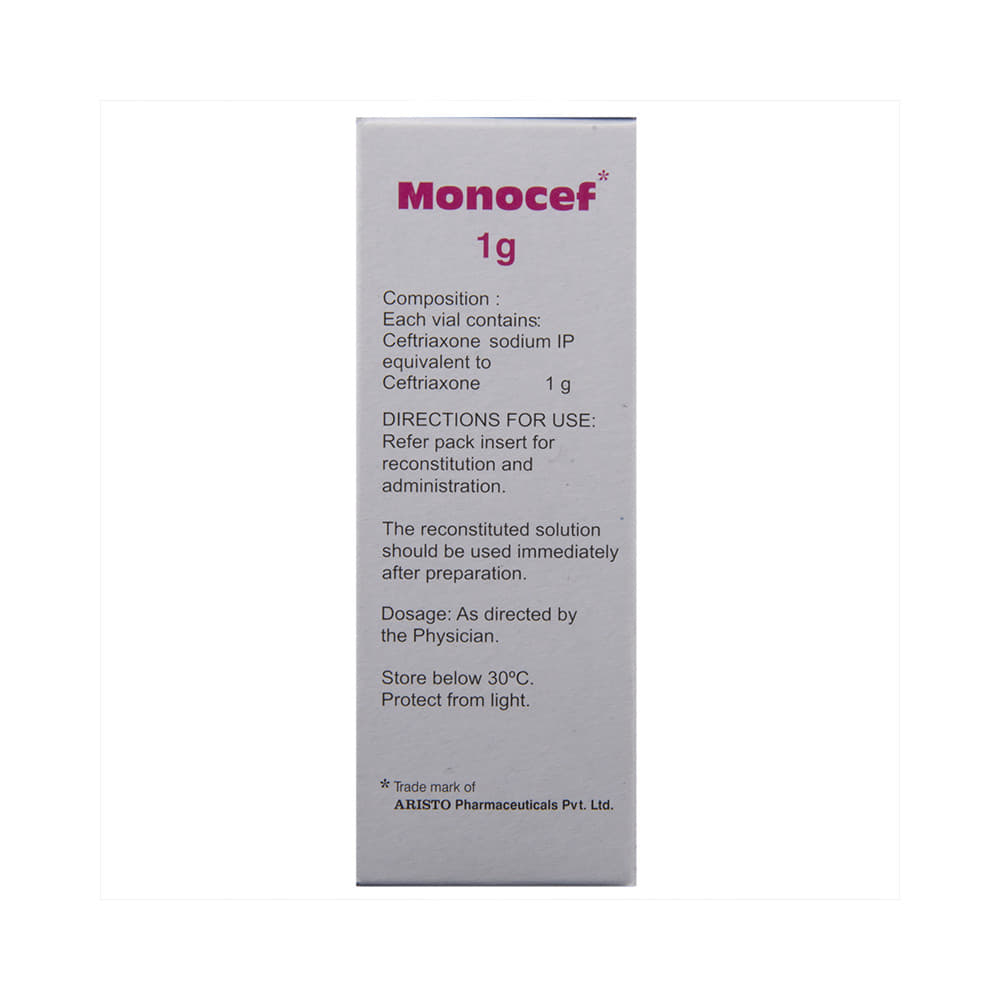 Monocef 1 g Injection is a medicine used to treat bacterial infections in your body. It is effective in infections of the brain (e.g., meningitis), lungs (e.g., pneumonia), ear, urinary tract, skin and soft tissues, bones and joints, blood, and heart. Monocef 1 g Injection may also be used to prevent infections during surgery. It is given as a drip (intravenous infusion) or as an injection directly into a vein or a muscle under the supervision of a doctor. Your doctor will decide the correct dose for you. This medicine will be given to you regularly at evenly spaced intervals as per the schedule prescribed by your doctor. Do not skip any doses and finish the full course of treatment even if you feel better. Stopping the medicine too early may lead to the return or worsening of the infection.The most common side effects of Monocef 1 g Injection include diarrhea, rash, changes in liver function tests, and blood cell counts (such as high eosinophil count, decreased white blood cells, and low blood platelets). Some people may develop temporary redness or pain at the site of injection. These side effects are usually mild, but let your doctor know if they bother you or do not go away.Before taking Monocef 1 g Injection, you should let your doctor know if you are allergic to any antibiotics or have any kidney or liver problems. You should also let your doctor know about all other medicines you are taking, as they may affect, or be affected by, this medicine.