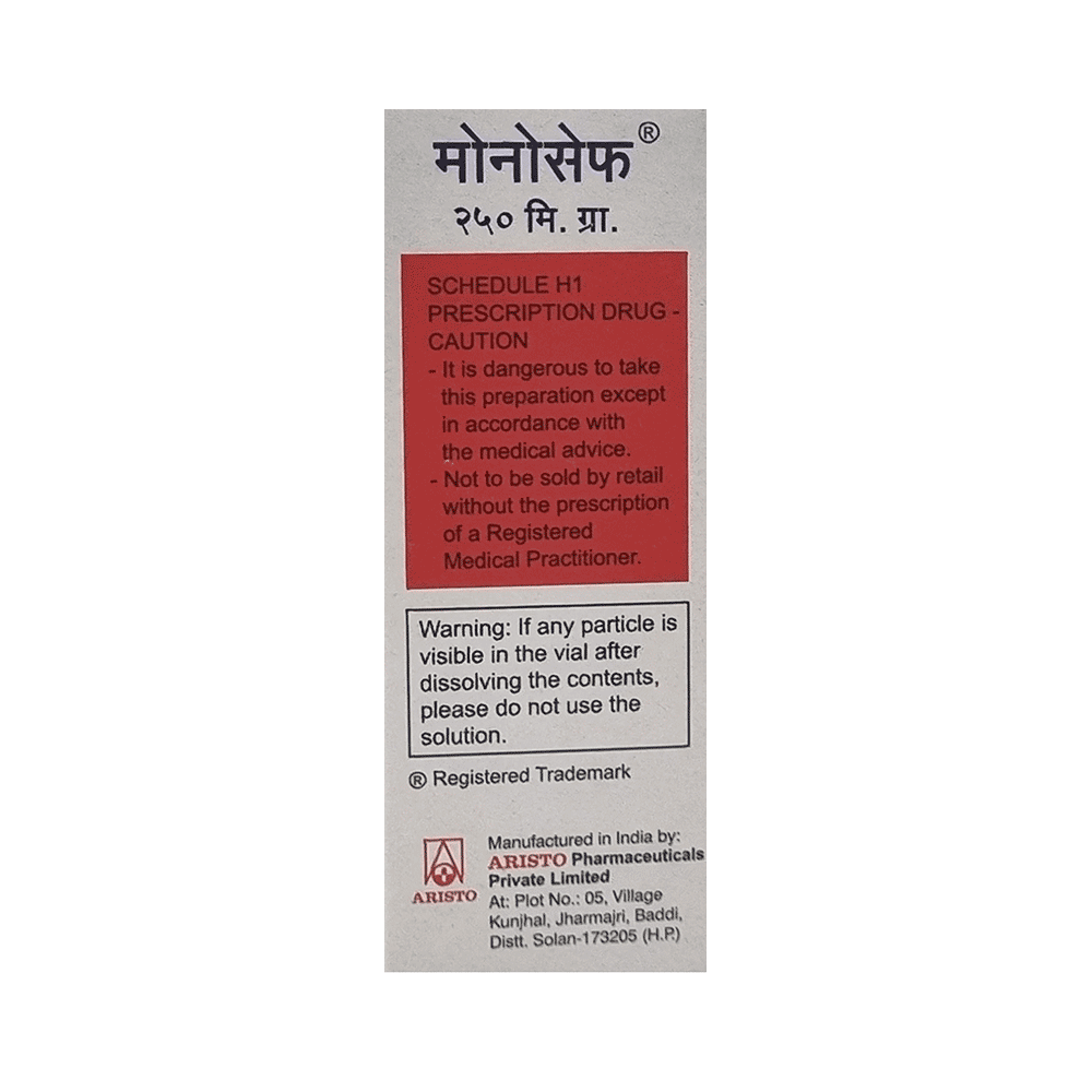 Monocef 250mg Injection is a medicine used to treat bacterial infections in your body. It is effective in infections of the brain (e.g., meningitis), lungs (e.g., pneumonia), ear, urinary tract, skin and soft tissues, bones and joints, blood, and heart. Monocef 250mg Injection may also be used to prevent infections during surgery. It is given as a drip (intravenous infusion) or as an injection directly into a vein or a muscle under the supervision of a doctor. Your doctor will decide the correct dose for you. This medicine will be given to you regularly at evenly spaced intervals as per the schedule prescribed by your doctor. Do not skip any doses and finish the full course of treatment even if you feel better. Stopping the medicine too early may lead to the return or worsening of the infection.The most common side effects of Monocef 250mg Injection include diarrhea, rash, changes in liver function tests, and blood cell counts (such as high eosinophil count, decreased white blood cells, and low blood platelets). Some people may develop temporary redness or pain at the site of injection. These side effects are usually mild, but let your doctor know if they bother you or do not go away.Before taking Monocef 250mg Injection, you should let your doctor know if you are allergic to any antibiotics or have any kidney or liver problems. You should also let your doctor know about all other medicines you are taking, as they may affect, or be affected by, this medicine.