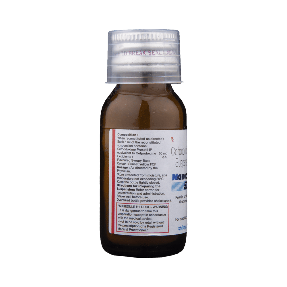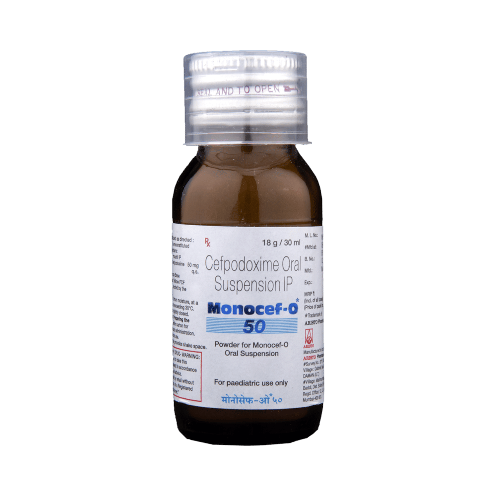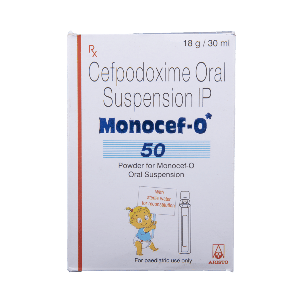 Monocef-O 50 Oral Suspension is an antibiotic medicine. It is commonly given to children for the treatment of a wide range of bacterial infections targeting the ears, eyes, nose, throat, lungs, skin, gastrointestinal tract, and urinary tract. It is also effective in treating typhoid fever in children and adolescents. Give this medicine to your child an hour before or two hours after meals. If your child develops a stomach upset, prefer giving it with food. Make sure to stick to the prescribed dose because it is given keeping in mind the type of infection, its severity, and the age and body weight of your child. In case your child gags and expels the medicine within 30 mins of intake, repeat the same dose but do not double dose if it's the time for the next dose.Do not give this medicine to your child in case of cold and flu symptoms as this medicine is an antibiotic and doesn’t work on infections caused by viruses. Doctors prescribe this medicine for cough and cold only when they detect any underlying secondary bacterial infection.Some of the minor and temporary side effects of this medicine include vomiting, diarrhea, nausea, rash, and headache. Usually, these episodes subside once your child’s body adapts to the medicine. However, if these effects persist or become bothersome for your child, call the doctor right away.Narrate your child’s complete medical history to your child’s doctor, including any previous episodes of allergy, heart problem, blood disorder, birth defects, airway obstruction, lung anomaly, gastrointestinal problem, skin disorder, liver impairment, and kidney malfunction. This information is critical for dose alterations and for planning your child’s overall treatment.