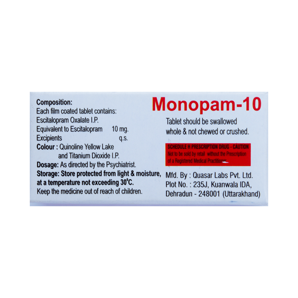 Monopam 10 Tablet is a selective serotonin reuptake inhibitor (SSRI) antidepressant. It works by increasing the levels of serotonin, a chemical messenger in the brain. This improves mood and physical symptoms of depression and also relieves symptoms of anxiety, panic attacks and obsessive-compulsive disorders.
