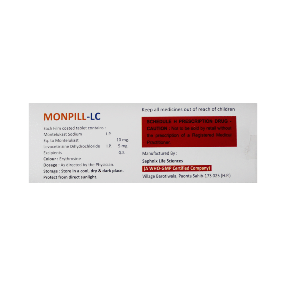 Monpill-LC Tablet is a combination medicine used in the treatment of allergic symptoms such as runny nose, stuffy nose, sneezing, itching, swelling, watery eyes and congestion or stuffiness. It also reduces inflammation in the airways and make breathing easier. Monpill-LC Tablet is taken with or without food in a dose and duration as advised by the doctor. The dose you are given will depend on your condition and how you respond to the medicine. You should keep taking this medicine for as long as your doctor recommends. If you stop treatment too early your symptoms may come back and your condition may worsen. Let your healthcare team know about all other medications you are taking as some may affect, or be affected by this medicine.The most common side effects are nausea, diarrhea, vomiting, dryness in the mouth, headache, skin rash, flu-like symptoms, and fatigue. Most of these are temporary and usually resolve with time. Contact your doctor straight away if you are at all concerned about any of these side effects. This medicine may cause dizziness and sleepiness, so do not drive or do anything that requires mental focus until you know how this medicine affects you. Avoid drinking alcohol while taking this medicine as it can worsen your sleepiness.Never support self-medication or recommend your medicine to another person. It is beneficial to have plenty of fluids while taking this medication. Before you start taking this medicine it is important to inform your doctor if you are suffering from kidney disease.