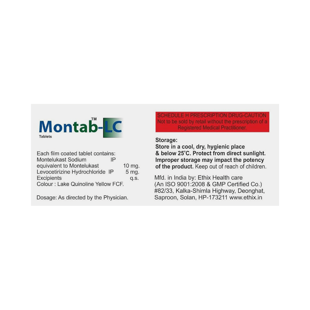 In Treatment of Allergic skin conditionsMontab-LC Tablet is effective in treating allergic skin conditions with inflammation and itching. It reduces the actions of chemicals in the body that cause inflammation of the skin. When used correctly it is a safe and effective treatment. It reduces the redness, rash, pain or itchiness caused by your skin’s reaction to an irritant. It thus improves your self-esteem and confidence as your appearance changes. Keep taking it for as long as it is prescribed to get the full benefits.In Treatment of Sneezing and runny nose due to allergiesMontab-LC Tablet is a combination medicine that provides relief from symptoms such as blocked or runny nose, sneezing and itchy or watery eyes. This will make it easier for you to go about your daily activities. It rarely has any serious side effects and you may only need to take it on days you have symptoms. If you are taking it to prevent getting symptoms you should use it regularly to get the most benefit.In Treatment of Hay feverHay fever, also called allergic rhinitis, causes cold-like signs and symptoms, such as a runny nose, itchy eyes, congestion, sneezing and sinus pressure. The only difference is that in hay fever, these symptoms are not produced due to a virus but are simply allergic responses of our body to allergens (allergy causing agents such as pollen). Montab-LC Tablet is used to provide relief from these symptoms of hay fever. It works by blocking the release of the chemical substance responsible for producing such allergy symptoms. Montab-LC Tablet is a safe medicine which helps treat hay fever and makes us feel at ease.show moreshow less