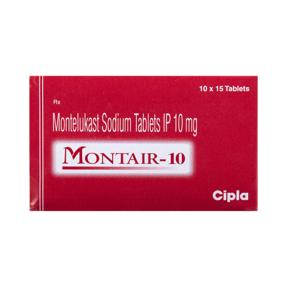 Montair 10 Tablet is a prescription medicine used for asthma prevention and for the treatment of allergy symptoms such as sneezing and runny nose. It reduces inflammation in the airways and makes breathing easier. Montair 10 Tablet can be taken with or without food. Take it at the same time to get the most benefit. It is advised to have it 2 hours before exercise if you have exercise-induced asthma. It should be taken as your doctor's advice. The dose and how often you take it depends on what you are taking it for. Your doctor will decide how much you need to improve your symptoms. You should take this medicine for as long as it is prescribed for you. It does not cure sudden breathing problems, so always carry a medicated inhaler with you. It is generally safe medicine with few common side effects include nausea, vomiting, headache, abdominal pain, and diarrhea. If these bother you or appear serious, let your doctor know. There may be ways of reducing or preventing them. Generally, you should avoid alcohol while taking this medicine.Before taking this medicine, you should tell your doctor if you have ever had severe liver problems. Your doctor should also know about all other medicines you are taking as many of these may make this medicine less effective or change the way it works. You must inform your doctor about pregnancy or breastfeeding.