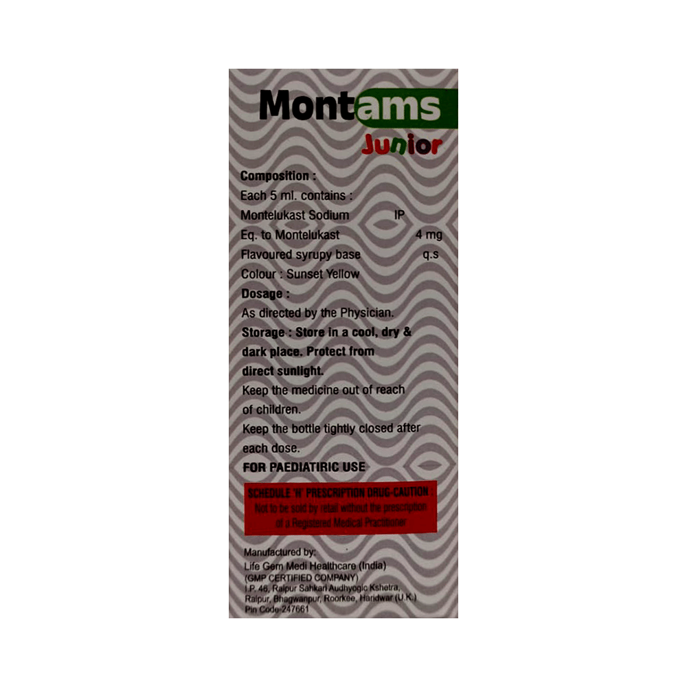 Montams Junior Oral Suspension is used to prevent asthma attacks in children. It may also be used to ease breathing difficulties caused by strenuous physical activities. This medicine also helps treat symptoms of skin and seasonal allergies, such as a runny nose, sneezing, itching, swelling, congestion, and watery eyes. Give Montams Junior Oral Suspension to your child at a fixed time before or after food in the prescribed dose, time, and way. Your child may start to feel better after a few regular doses. However, you must still complete the treatment to ensure maximum benefit. Moreover, stopping the medicine abruptly may worsen your child’s condition.Montams Junior Oral Suspension may cause some minor and temporary side effects like fever, headache, abdominal pain, and diarrhea. Usually, these side effects subside once your child’s body adapts to the medicine. However, in case these effects persist or start bothering your child, consult your child’s doctor without any delay.Let your child’s doctor know if your child is already taking any medicines. Also, narrate your child’s complete medical history, including any prior episodes of allergy, heart problems, blood disorders, vascular disorders, birth defects, airway obstruction, lung anomaly, skin disorder, liver impairment, and kidney malfunction. This information is critical for adjusting doses and planning your child's treatment.