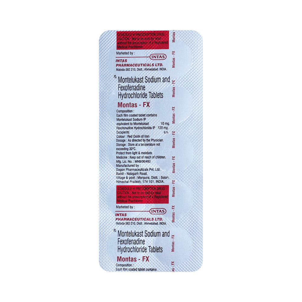 In Treatment of Sneezing and runny nose due to allergiesMontas-FX Tablet is a combination medicine that provides relief from symptoms such as blocked or runny nose, sneezing and itchy or watery eyes. This will make it easier for you to go about your daily activities. It rarely has any serious side effects and you may only need to take it on days you have symptoms. If you are taking it to prevent getting symptoms you should use it regularly to get the most benefit.