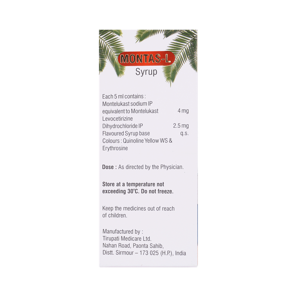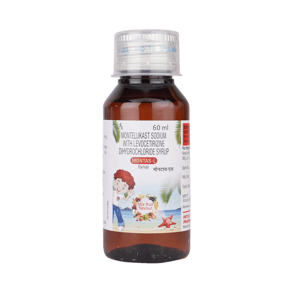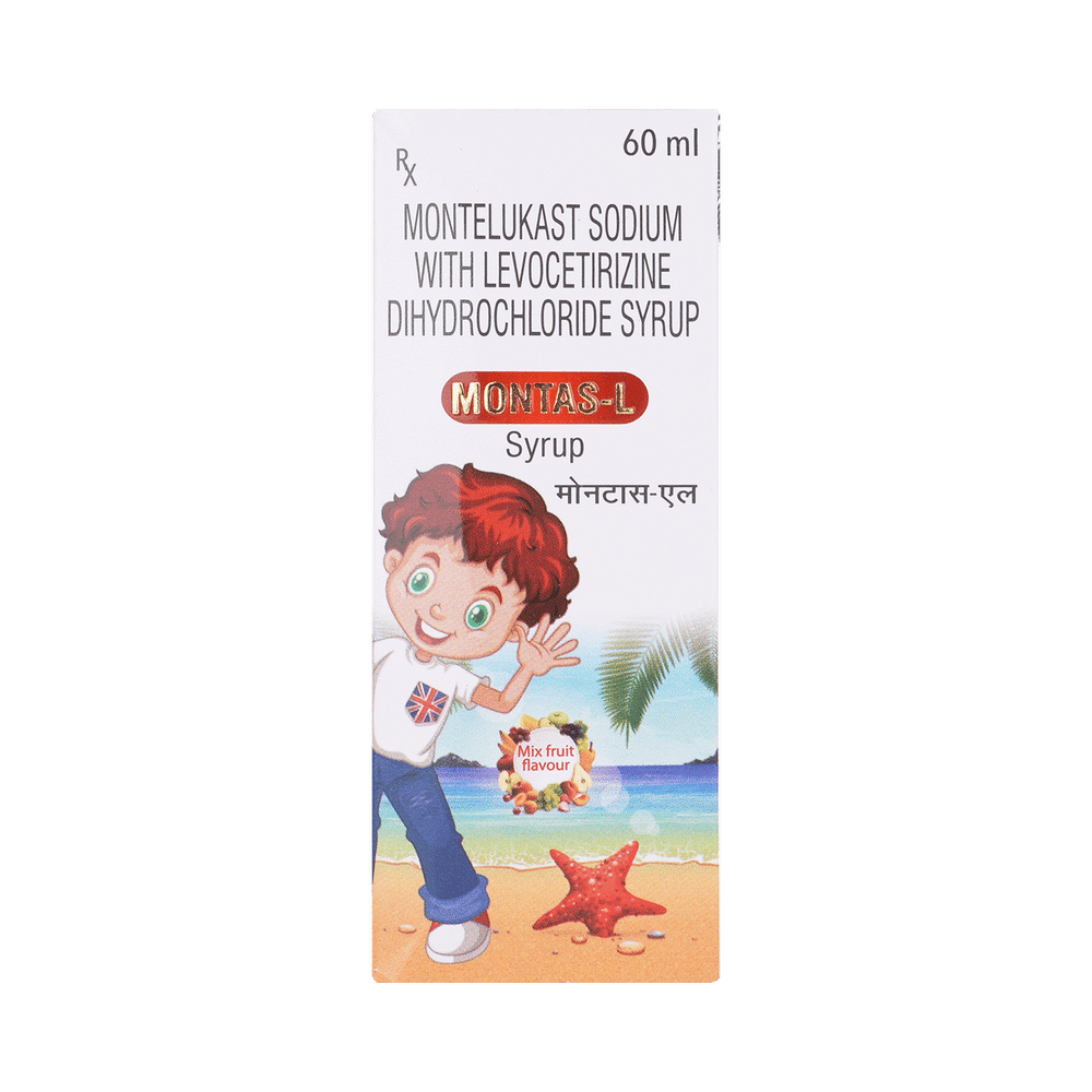 Montas-L is commonly prescribed in children to treat symptoms of allergy such as runny nose, sneezing, itching, swelling, congestion, and watery eyes. It may also help in the treatment of asthma and skin allergies. Give this medicine to your child at a fixed time before or after food in the prescribed dose, time, and way. For asthma, prefer giving Montas-L in the evening or 2 hours before physical activity. For allergy, it is best to give it either in the morning or in the evening, depending upon the time of onset of symptoms. In case your child has both, prefer giving it in the evening. If your child vomits within 30 minutes of taking this medicine, give the same dose again, but skip it if it’s already time for the next dose.Your child may start to feel better after a few regular doses. However, you must still complete the prescribed dose to ensure maximum benefit. Moreover, stopping the medicine abruptly may worsen your child’s condition. This medicine may cause some minor and temporary side effects like vomiting, diarrhea, nausea, dizziness, dry mouth, rash, and headache. Usually, these episodes subside once your child’s body adapts to the medicine. However, in case these effects persist or start bothering your child, consult your child’s doctor without any delay.Let your child’s doctor know if your child is already taking any medicines. Also, narrate your child’s complete medical history, including any prior episodes of allergy, heart problem, blood disorder, vascular disorders, birth defects, airway obstruction, lung anomaly, skin disorder, liver impairment, and kidney malfunction. This information is critical for dose alterations and in planning your child’s overall treatment.