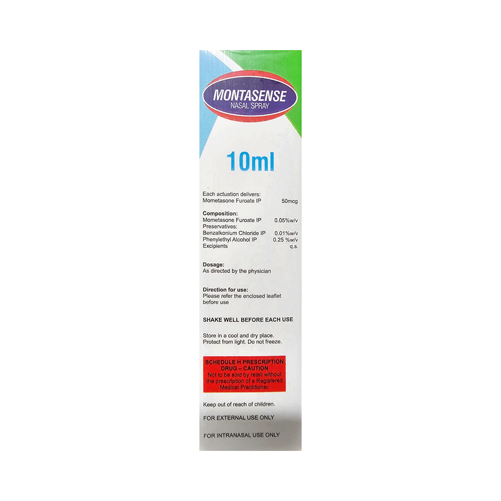 Montasense Nasal Spray is a medicine used to prevent and treat allergic symptoms like sneezing and runny nose due to allergies, nasal congestion, and nasal polyps. It works by reducing swelling and irritation in your nose and belongs to a group of medicines called corticosteroids. You should always use Montasense Nasal Spray as advised by your doctor. To get the full benefit of the medicine you should take it regularly. Blow your nose gently before using it, keep one nostril closed while applying the medicine into the other, and then sniff hard to make sure it reaches deep into the nose. Repeat for the other nostril.The most common side effects of this medicine include nasal irritation, sore throat, wheezing, nosebleed, upper respiratory tract infection, viral infections, and vomiting. If you are worried about any of the side effects, let your doctor know. Your doctor might be able to help you cope with the side effects. In general, you should try to avoid situations which make your symptoms worse (things like pollen and dust mites) and it’s best not to smoke.Before using this medicine, you should ask your doctor for advice if you are pregnant or breastfeeding. It is important to discuss the risks and benefits with your doctor. Let your doctor also know if you have any other medical conditions taking any other medicines.