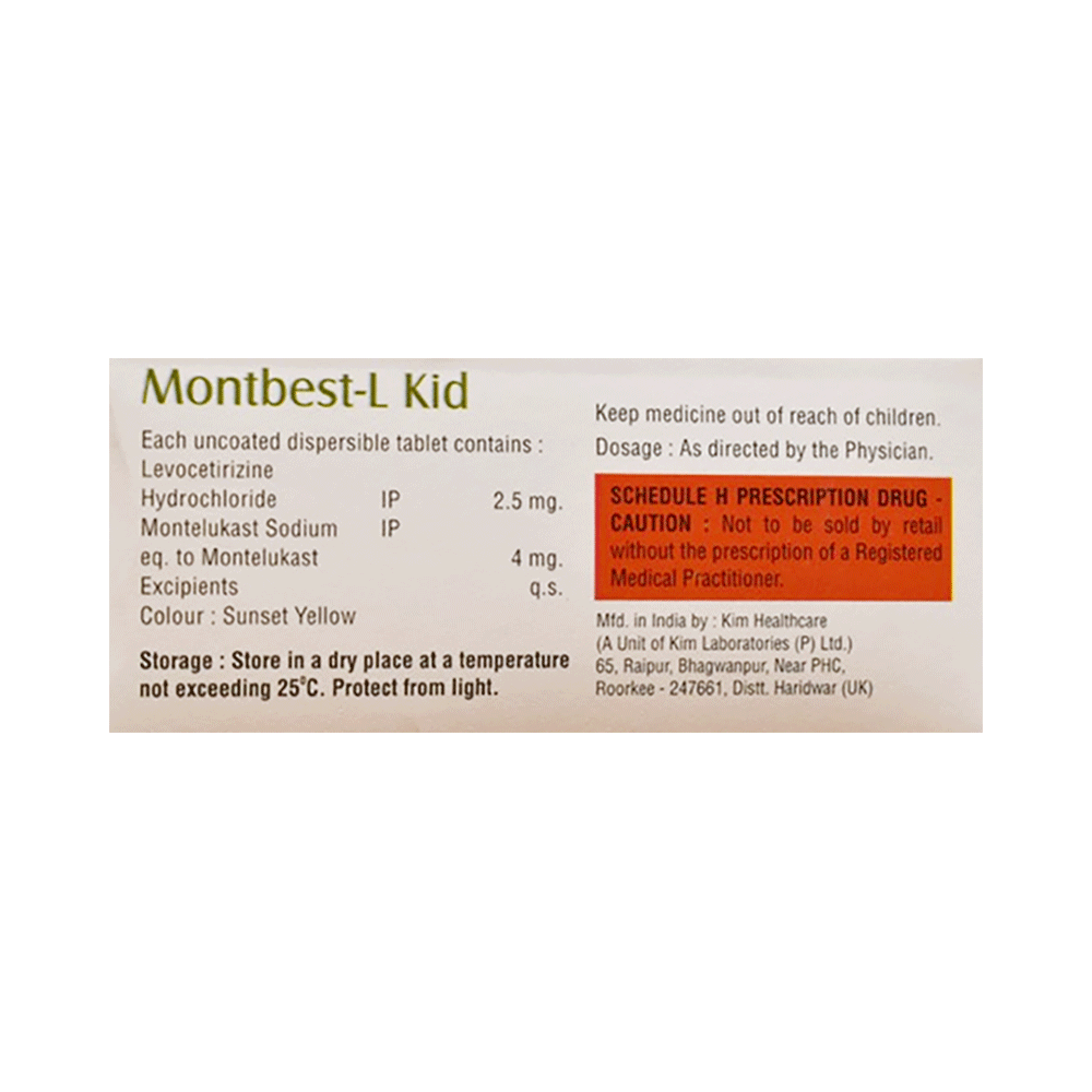 Montbest-L Kid Tablet DT is commonly prescribed in children to treat symptoms of allergy such as runny nose, sneezing, itching, swelling, congestion, and watery eyes. It may also help in the treatment of asthma and skin allergies. Give this medicine to your child at a fixed time before or after food in the prescribed dose, time, and way. For asthma, prefer giving Montbest-L Kid Tablet DT in the evening or 2 hours before physical activity. For allergy, it is best to give it either in the morning or in the evening, depending upon the time of onset of symptoms. In case your child has both, prefer giving it in the evening. If your child vomits within 30 minutes of taking this medicine, give the same dose again, but skip it if it’s already time for the next dose.Your child may start to feel better after a few regular doses. However, you must still complete the prescribed dose to ensure maximum benefit. Moreover, stopping the medicine abruptly may worsen your child’s condition. This medicine may cause some minor and temporary side effects like vomiting, diarrhea, nausea, dizziness, dry mouth, rash, and headache. Usually, these episodes subside once your child’s body adapts to the medicine. However, in case these effects persist or start bothering your child, consult your child’s doctor without any delay.Let your child’s doctor know if your child is already taking any medicines. Also, narrate your child’s complete medical history, including any prior episodes of allergy, heart problem, blood disorder, vascular disorders, birth defects, airway obstruction, lung anomaly, skin disorder, liver impairment, and kidney malfunction. This information is critical for dose alterations and in planning your child’s overall treatment.