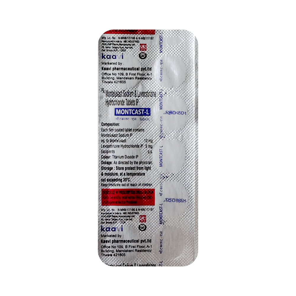 In Treatment of Allergic skin conditionsMontcast-L Tablet is effective in treating allergic skin conditions with inflammation and itching. It reduces the actions of chemicals in the body that cause inflammation of the skin. When used correctly it is a safe and effective treatment. It reduces the redness, rash, pain or itchiness caused by your skin’s reaction to an irritant. It thus improves your self-esteem and confidence as your appearance changes. Keep taking it for as long as it is prescribed to get the full benefits.In Treatment of Sneezing and runny nose due to allergiesMontcast-L Tablet is a combination medicine that provides relief from symptoms such as blocked or runny nose, sneezing and itchy or watery eyes. This will make it easier for you to go about your daily activities. It rarely has any serious side effects and you may only need to take it on days you have symptoms. If you are taking it to prevent getting symptoms you should use it regularly to get the most benefit.In Treatment of Hay feverHay fever, also called allergic rhinitis, causes cold-like signs and symptoms, such as a runny nose, itchy eyes, congestion, sneezing and sinus pressure. The only difference is that in hay fever, these symptoms are not produced due to a virus but are simply allergic responses of our body to allergens (allergy causing agents such as pollen). Montcast-L Tablet is used to provide relief from these symptoms of hay fever. It works by blocking the release of the chemical substance responsible for producing such allergy symptoms. Montcast-L Tablet is a safe medicine which helps treat hay fever and makes us feel at ease.show moreshow less