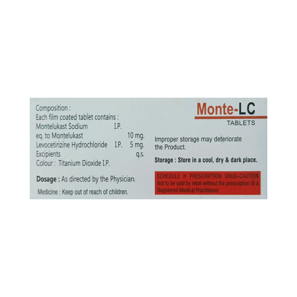 In Treatment of Allergic skin conditionsMonte-LC Tablet is effective in treating allergic skin conditions with inflammation and itching. It reduces the actions of chemicals in the body that cause inflammation of the skin. When used correctly it is a safe and effective treatment. It reduces the redness, rash, pain or itchiness caused by your skin’s reaction to an irritant. It thus improves your self-esteem and confidence as your appearance changes. Keep taking it for as long as it is prescribed to get the full benefits.In Treatment of Sneezing and runny nose due to allergiesMonte-LC Tablet is a combination medicine that provides relief from symptoms such as blocked or runny nose, sneezing and itchy or watery eyes. This will make it easier for you to go about your daily activities. It rarely has any serious side effects and you may only need to take it on days you have symptoms. If you are taking it to prevent getting symptoms you should use it regularly to get the most benefit.In Treatment of Hay feverHay fever, also called allergic rhinitis, causes cold-like signs and symptoms, such as a runny nose, itchy eyes, congestion, sneezing and sinus pressure. The only difference is that in hay fever, these symptoms are not produced due to a virus but are simply allergic responses of our body to allergens (allergy causing agents such as pollen). Monte-LC Tablet is used to provide relief from these symptoms of hay fever. It works by blocking the release of the chemical substance responsible for producing such allergy symptoms. Monte-LC Tablet is a safe medicine which helps treat hay fever and makes us feel at ease.show moreshow less