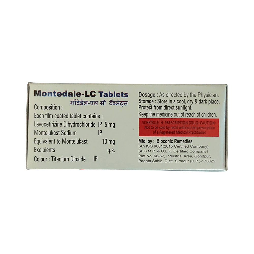 Montedale-LC Tablet is a combination medicine used in the treatment of allergic symptoms such as runny nose, stuffy nose, sneezing, itching, swelling, watery eyes and congestion or stuffiness. It also reduces inflammation in the airways and make breathing easier. Montedale-LC Tablet is taken with or without food in a dose and duration as advised by the doctor. The dose you are given will depend on your condition and how you respond to the medicine. You should keep taking this medicine for as long as your doctor recommends. If you stop treatment too early your symptoms may come back and your condition may worsen. Let your healthcare team know about all other medications you are taking as some may affect, or be affected by this medicine.The most common side effects are nausea, diarrhea, vomiting, dryness in the mouth, headache, skin rash, flu-like symptoms, and fatigue. Most of these are temporary and usually resolve with time. Contact your doctor straight away if you are at all concerned about any of these side effects. This medicine may cause dizziness and sleepiness, so do not drive or do anything that requires mental focus until you know how this medicine affects you. Avoid drinking alcohol while taking this medicine as it can worsen your sleepiness.Never support self-medication or recommend your medicine to another person. It is beneficial to have plenty of fluids while taking this medication. Before you start taking this medicine it is important to inform your doctor if you are suffering from kidney disease.