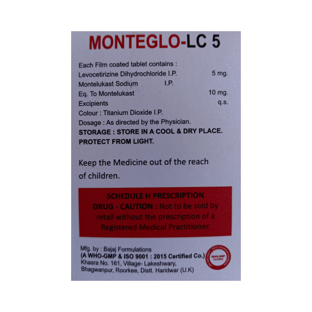 In Treatment of Allergic skin conditionsMonteglo-LC 5 Tablet is effective in treating allergic skin conditions with inflammation and itching. It reduces the actions of chemicals in the body that cause inflammation of the skin. When used correctly it is a safe and effective treatment. It reduces the redness, rash, pain or itchiness caused by your skin’s reaction to an irritant. It thus improves your self-esteem and confidence as your appearance changes. Keep taking it for as long as it is prescribed to get the full benefits.In Treatment of Sneezing and runny nose due to allergiesMonteglo-LC 5 Tablet is a combination medicine that provides relief from symptoms such as blocked or runny nose, sneezing and itchy or watery eyes. This will make it easier for you to go about your daily activities. It rarely has any serious side effects and you may only need to take it on days you have symptoms. If you are taking it to prevent getting symptoms you should use it regularly to get the most benefit.In Treatment of Hay feverHay fever, also called allergic rhinitis, causes cold-like signs and symptoms, such as a runny nose, itchy eyes, congestion, sneezing and sinus pressure. The only difference is that in hay fever, these symptoms are not produced due to a virus but are simply allergic responses of our body to allergens (allergy causing agents such as pollen). Monteglo-LC 5 Tablet is used to provide relief from these symptoms of hay fever. It works by blocking the release of the chemical substance responsible for producing such allergy symptoms. Monteglo-LC 5 Tablet is a safe medicine which helps treat hay fever and makes us feel at ease.show moreshow less