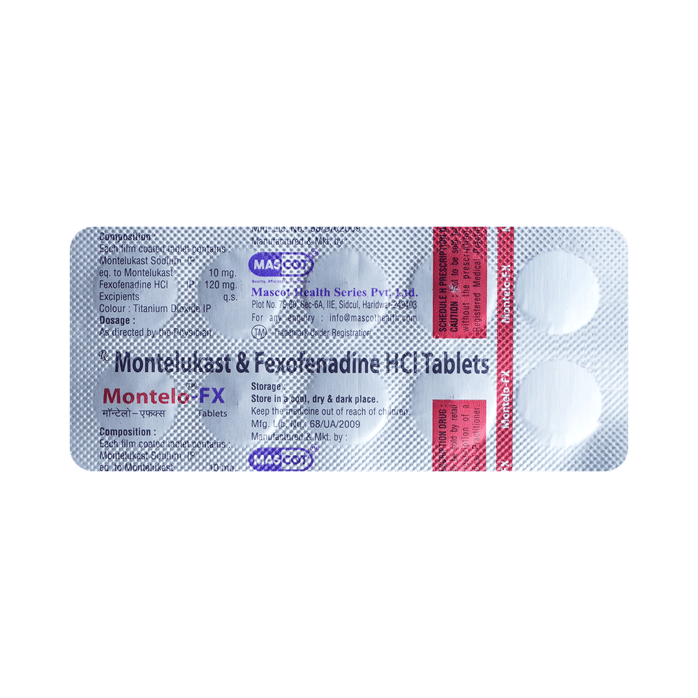 In Treatment of Sneezing and runny nose due to allergiesMontelo-FX Tablet is a combination medicine that provides relief from symptoms such as blocked or runny nose, sneezing and itchy or watery eyes. This will make it easier for you to go about your daily activities. It rarely has any serious side effects and you may only need to take it on days you have symptoms. If you are taking it to prevent getting symptoms you should use it regularly to get the most benefit.