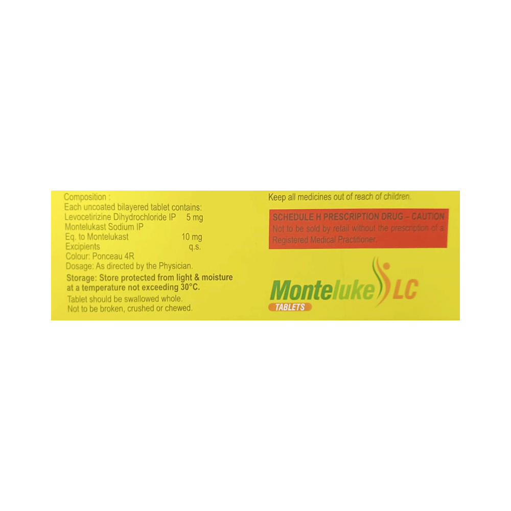 Monteluke LC Tablet is a combination medicine used in the treatment of allergic symptoms such as runny nose, stuffy nose, sneezing, itching, swelling, watery eyes and congestion or stuffiness. It also reduces inflammation in the airways and make breathing easier. Monteluke LC Tablet is taken with or without food in a dose and duration as advised by the doctor. The dose you are given will depend on your condition and how you respond to the medicine. You should keep taking this medicine for as long as your doctor recommends. If you stop treatment too early your symptoms may come back and your condition may worsen. Let your healthcare team know about all other medications you are taking as some may affect, or be affected by this medicine.The most common side effects are nausea, diarrhea, vomiting, dryness in the mouth, headache, skin rash, flu-like symptoms, and fatigue. Most of these are temporary and usually resolve with time. Contact your doctor straight away if you are at all concerned about any of these side effects. This medicine may cause dizziness and sleepiness, so do not drive or do anything that requires mental focus until you know how this medicine affects you. Avoid drinking alcohol while taking this medicine as it can worsen your sleepiness.Never support self-medication or recommend your medicine to another person. It is beneficial to have plenty of fluids while taking this medication. Before you start taking this medicine it is important to inform your doctor if you are suffering from kidney disease.
