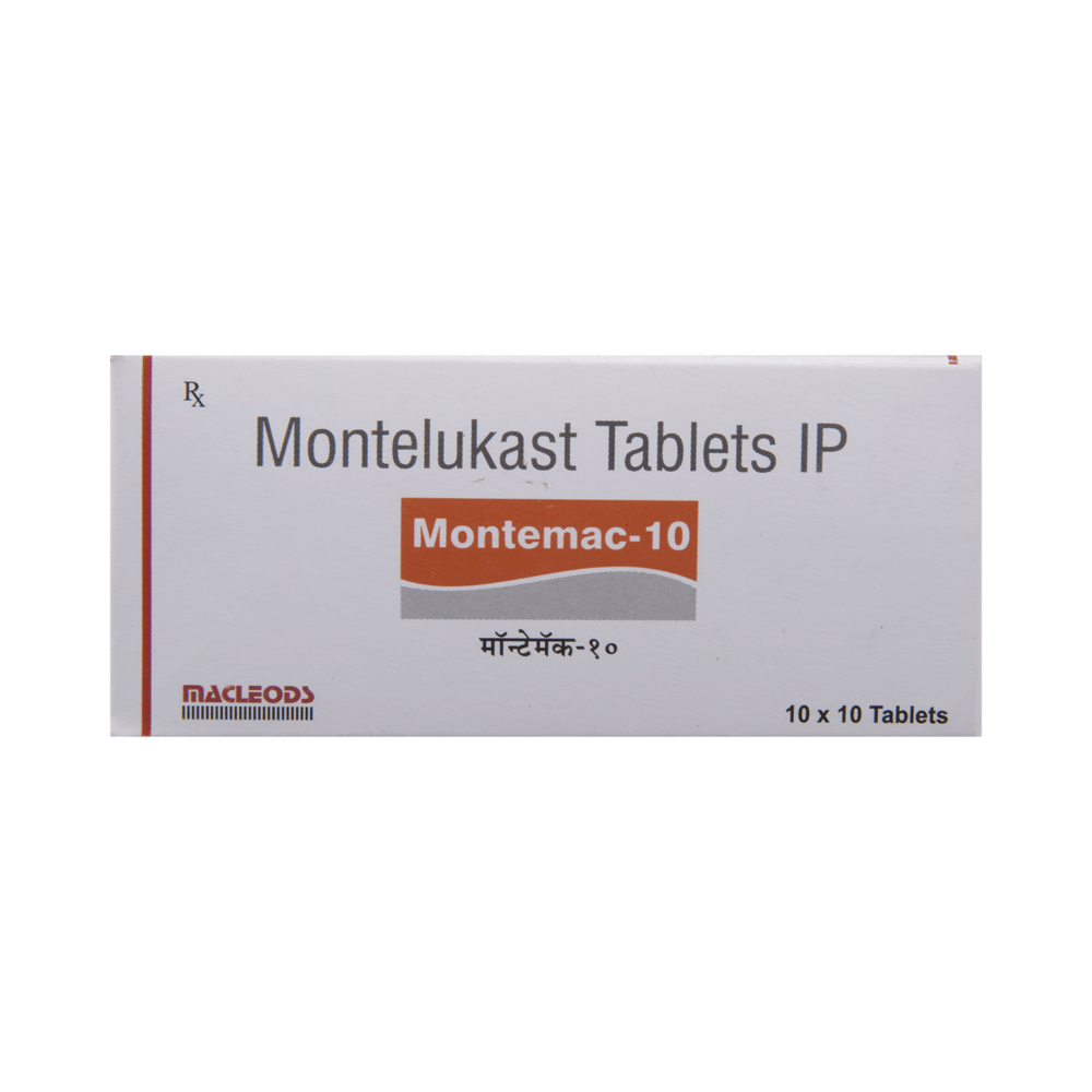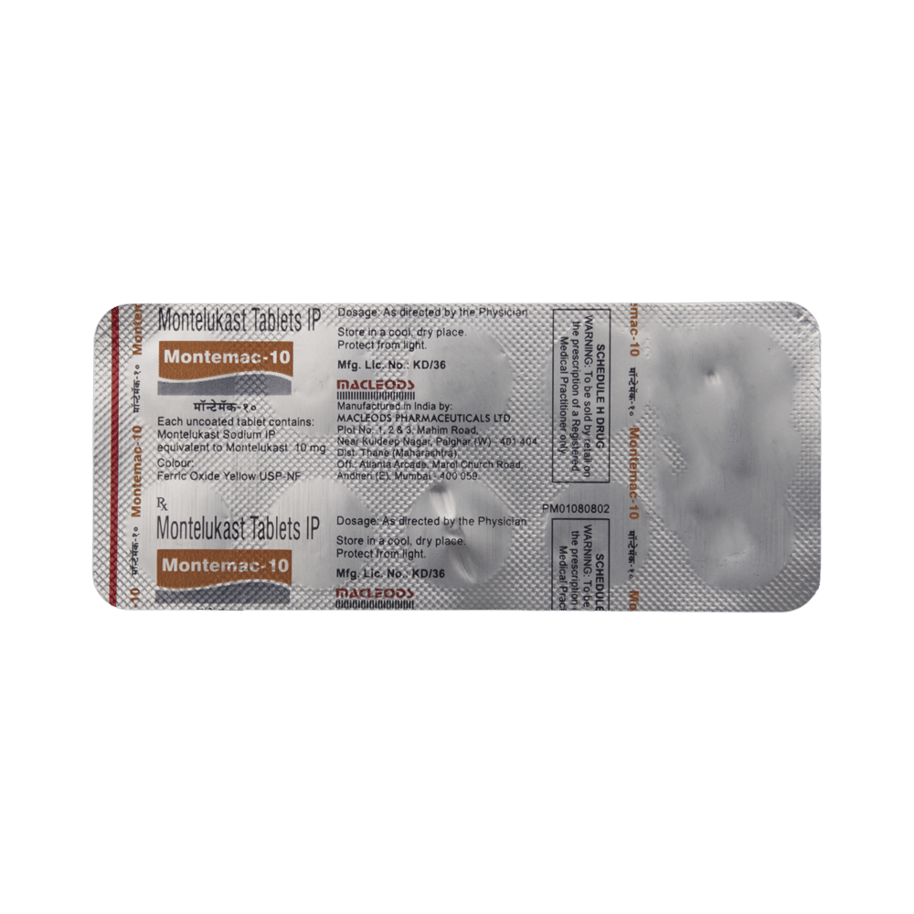 Montemac 10 Tablet is a prescription medicine used for asthma prevention and for the treatment of allergy symptoms such as sneezing and runny nose. It reduces inflammation in the airways and makes breathing easier. Montemac 10 Tablet can be taken with or without food. Take it at the same time to get the most benefit. It is advised to have it 2 hours before exercise if you have exercise-induced asthma. It should be taken as your doctor's advice. The dose and how often you take it depends on what you are taking it for. Your doctor will decide how much you need to improve your symptoms. You should take this medicine for as long as it is prescribed for you. It does not cure sudden breathing problems, so always carry a medicated inhaler with you. It is generally safe medicine with few common side effects include nausea, vomiting, headache, abdominal pain, and diarrhea. If these bother you or appear serious, let your doctor know. There may be ways of reducing or preventing them. Generally, you should avoid alcohol while taking this medicine.Before taking this medicine, you should tell your doctor if you have ever had severe liver problems. Your doctor should also know about all other medicines you are taking as many of these may make this medicine less effective or change the way it works. You must inform your doctor about pregnancy or breastfeeding.