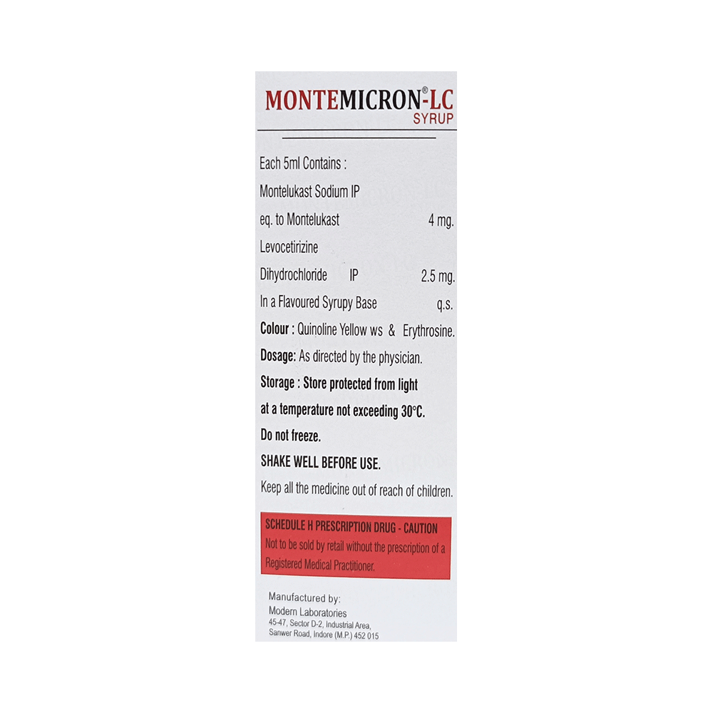 Montemicron-LC Syrup is commonly prescribed in children to treat symptoms of allergy such as runny nose, sneezing, itching, swelling, congestion, and watery eyes. It may also help in the treatment of asthma and skin allergies. Give this medicine to your child at a fixed time before or after food in the prescribed dose, time, and way. For asthma, prefer giving Montemicron-LC Syrup in the evening or 2 hours before physical activity. For allergy, it is best to give it either in the morning or in the evening, depending upon the time of onset of symptoms. In case your child has both, prefer giving it in the evening. If your child vomits within 30 minutes of taking this medicine, give the same dose again, but skip it if it’s already time for the next dose.Your child may start to feel better after a few regular doses. However, you must still complete the prescribed dose to ensure maximum benefit. Moreover, stopping the medicine abruptly may worsen your child’s condition. This medicine may cause some minor and temporary side effects like vomiting, diarrhea, nausea, dizziness, dry mouth, rash, and headache. Usually, these episodes subside once your child’s body adapts to the medicine. However, in case these effects persist or start bothering your child, consult your child’s doctor without any delay.Let your child’s doctor know if your child is already taking any medicines. Also, narrate your child’s complete medical history, including any prior episodes of allergy, heart problem, blood disorder, vascular disorders, birth defects, airway obstruction, lung anomaly, skin disorder, liver impairment, and kidney malfunction. This information is critical for dose alterations and in planning your child’s overall treatment.