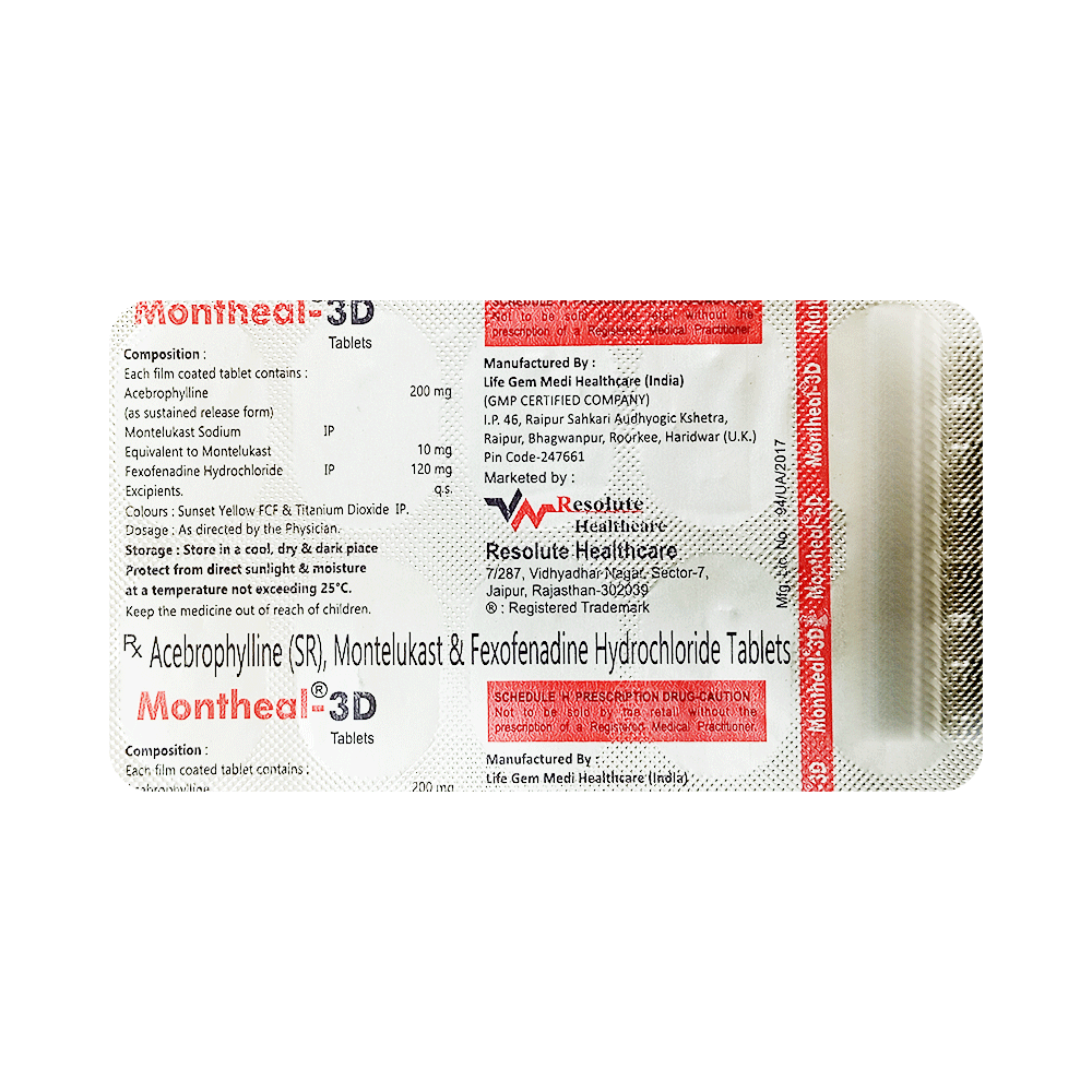Montheal-3D Tablet SR is a combination medicine used in the prevention of asthma. It relieves allergy symptoms such as runny nose, stuffy nose, sneezing, watery eyes and congestion or stuffiness. It also helps in relaxing the muscles of the air passages, thus widening it and making it easier to breathe. Montheal-3D Tablet SR is taken with or without food in a dose and duration as advised by the doctor. The dose you are given will depend on your condition and how you respond to the medicine. You should keep taking this medicine for as long as your doctor recommends. If you stop treatment too early your symptoms may come back and your condition may worsen. Let your healthcare team know about all other medications you are taking as some may affect, or be affected by this medicine.The most common side effects are nausea, vomiting, stomach pain, diarrhea, skin rash, itching, breathing difficulty, and headache. Most of these are temporary and usually resolve with time. Contact your doctor straight away if you are at all concerned about any of these side effects. This medicine may cause dizziness and sleepiness, so do not drive or do anything that requires mental focus until you know how this medicine affects you. Avoid drinking alcohol while taking this medicine as it can worsen your sleepiness.Before taking it, you should tell your doctor if you have any kidney or liver diseases so that your doctor can prescribe a suitable dose for you. You should also tell your doctor if you are pregnant, planning pregnancy or breastfeeding.