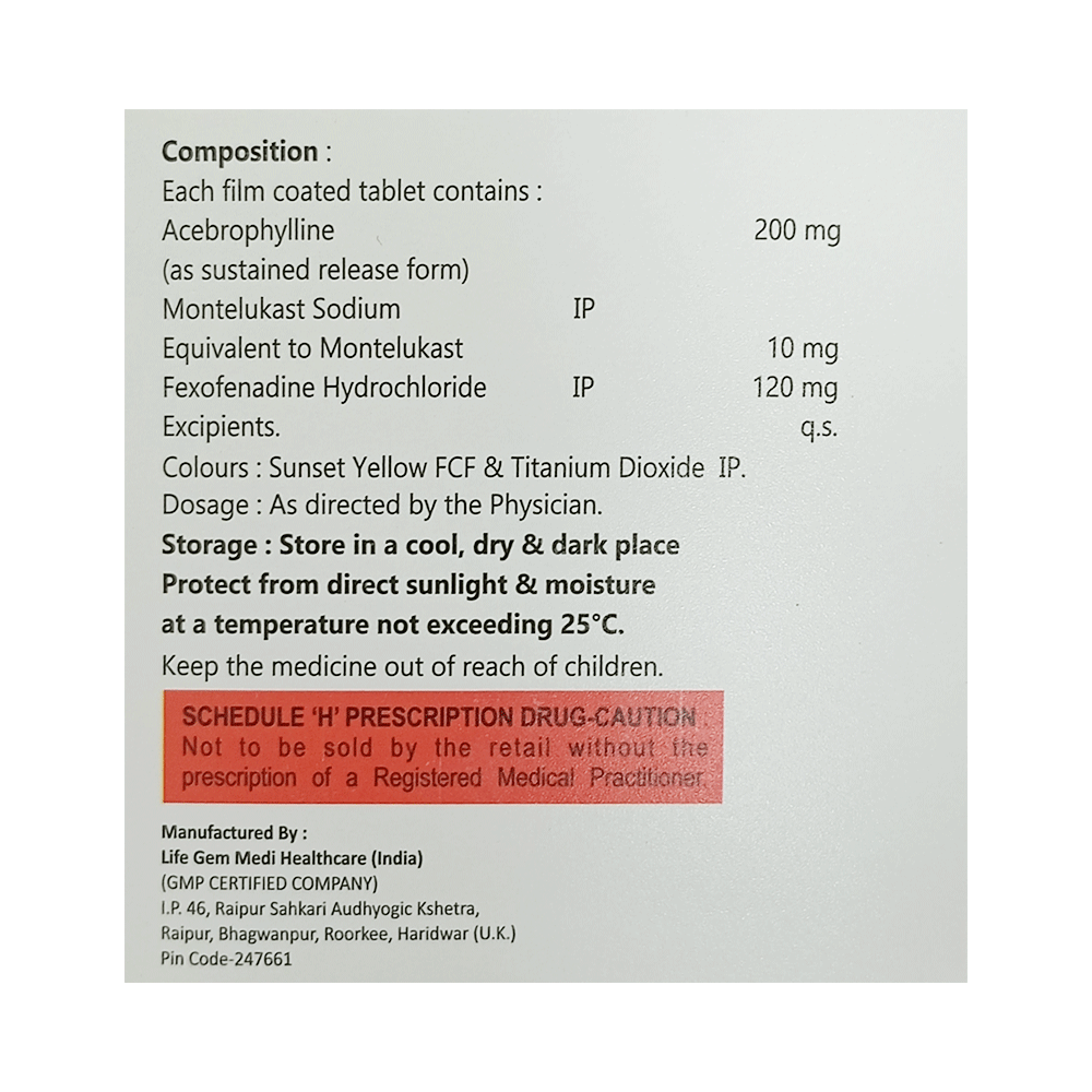 Salt Composition: Montelukast (10mg) + Fexofenadine (120mg) + Acebrophylline (200mg)