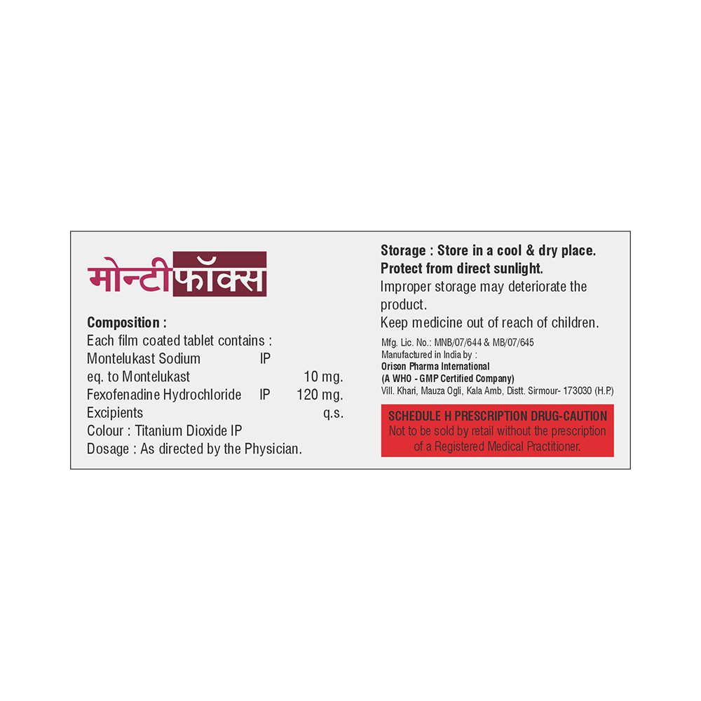 In Treatment of Sneezing and runny nose due to allergiesMontifox Tablet is a combination medicine that provides relief from symptoms such as blocked or runny nose, sneezing and itchy or watery eyes. This will make it easier for you to go about your daily activities. It rarely has any serious side effects and you may only need to take it on days you have symptoms. If you are taking it to prevent getting symptoms you should use it regularly to get the most benefit.