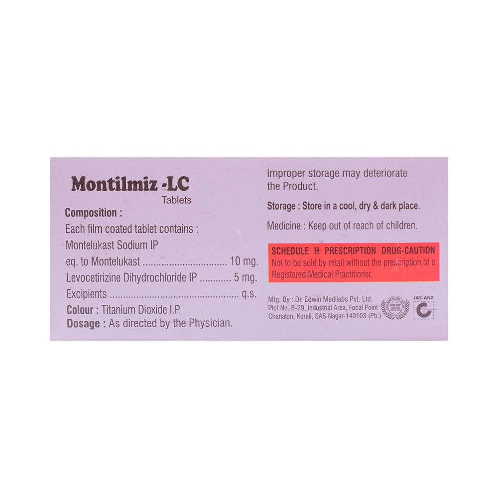 Montilmiz-LC Tablet is a combination medicine used in the treatment of allergic symptoms such as runny nose, stuffy nose, sneezing, itching, swelling, watery eyes and congestion or stuffiness. It also reduces inflammation in the airways and make breathing easier. Montilmiz-LC Tablet is taken with or without food in a dose and duration as advised by the doctor. The dose you are given will depend on your condition and how you respond to the medicine. You should keep taking this medicine for as long as your doctor recommends. If you stop treatment too early your symptoms may come back and your condition may worsen. Let your healthcare team know about all other medications you are taking as some may affect, or be affected by this medicine.The most common side effects are nausea, diarrhea, vomiting, dryness in the mouth, headache, skin rash, flu-like symptoms, and fatigue. Most of these are temporary and usually resolve with time. Contact your doctor straight away if you are at all concerned about any of these side effects. This medicine may cause dizziness and sleepiness, so do not drive or do anything that requires mental focus until you know how this medicine affects you. Avoid drinking alcohol while taking this medicine as it can worsen your sleepiness.Never support self-medication or recommend your medicine to another person. It is beneficial to have plenty of fluids while taking this medication. Before you start taking this medicine it is important to inform your doctor if you are suffering from kidney disease.
