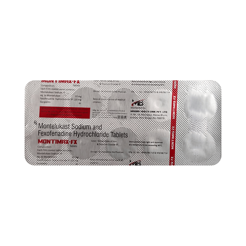 Montimax-FX Tablet is a combination medicine used in the treatment of allergy symptoms such as runny nose, stuffy nose, sneezing, watery eyes, and congestion or stuffiness. Montimax-FX Tablet is taken with or without food in a dose and duration as advised by the doctor. The dose you are given will depend on your condition and how you respond to the medicine. You should keep taking this medicine for as long as your doctor recommends. If you stop treatment too early your symptoms may come back and your condition may worsen. Let your healthcare team know about all other medications you are taking as some may affect, or be affected by this medicine.The most common side effects include nausea, diarrhea, vomiting, skin rash, flu-like symptoms, and headache. Most of these are temporary and usually resolve with time. Contact your doctor straight away if you are at all concerned about any of these side effects. This medicine may cause dizziness and sleepiness, so do not drive or do anything that requires mental focus until you know how this medicine affects you. Avoid drinking alcohol while taking this medicine as it can worsen your sleepiness.Never support self-medication or recommend your medicine to another person. It is beneficial to have plenty of fluids while taking this medication. Before you start taking this medicine it is important to inform your doctor if you are suffering from liver or kidney disease. You should also tell your doctor if you are pregnant, planning pregnancy or breastfeeding.