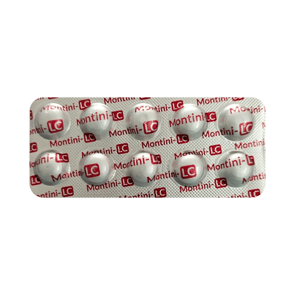 Montini-LC Tablet is a combination medicine used in the treatment of allergic symptoms such as runny nose, stuffy nose, sneezing, itching, swelling, watery eyes and congestion or stuffiness. It also reduces inflammation in the airways and make breathing easier. Montini-LC Tablet is taken with or without food in a dose and duration as advised by the doctor. The dose you are given will depend on your condition and how you respond to the medicine. You should keep taking this medicine for as long as your doctor recommends. If you stop treatment too early your symptoms may come back and your condition may worsen. Let your healthcare team know about all other medications you are taking as some may affect, or be affected by this medicine.The most common side effects are nausea, diarrhea, vomiting, dryness in the mouth, headache, skin rash, flu-like symptoms, and fatigue. Most of these are temporary and usually resolve with time. Contact your doctor straight away if you are at all concerned about any of these side effects. This medicine may cause dizziness and sleepiness, so do not drive or do anything that requires mental focus until you know how this medicine affects you. Avoid drinking alcohol while taking this medicine as it can worsen your sleepiness.Never support self-medication or recommend your medicine to another person. It is beneficial to have plenty of fluids while taking this medication. Before you start taking this medicine it is important to inform your doctor if you are suffering from kidney disease.