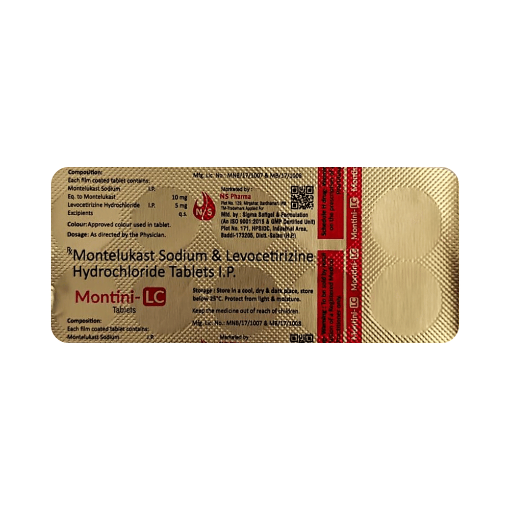 In Treatment of Allergic skin conditionsMontini-LC Tablet is effective in treating allergic skin conditions with inflammation and itching. It reduces the actions of chemicals in the body that cause inflammation of the skin. When used correctly it is a safe and effective treatment. It reduces the redness, rash, pain or itchiness caused by your skin’s reaction to an irritant. It thus improves your self-esteem and confidence as your appearance changes. Keep taking it for as long as it is prescribed to get the full benefits.In Treatment of Sneezing and runny nose due to allergiesMontini-LC Tablet is a combination medicine that provides relief from symptoms such as blocked or runny nose, sneezing and itchy or watery eyes. This will make it easier for you to go about your daily activities. It rarely has any serious side effects and you may only need to take it on days you have symptoms. If you are taking it to prevent getting symptoms you should use it regularly to get the most benefit.In Treatment of Hay feverHay fever, also called allergic rhinitis, causes cold-like signs and symptoms, such as a runny nose, itchy eyes, congestion, sneezing and sinus pressure. The only difference is that in hay fever, these symptoms are not produced due to a virus but are simply allergic responses of our body to allergens (allergy causing agents such as pollen). Montini-LC Tablet is used to provide relief from these symptoms of hay fever. It works by blocking the release of the chemical substance responsible for producing such allergy symptoms. Montini-LC Tablet is a safe medicine which helps treat hay fever and makes us feel at ease.show moreshow less