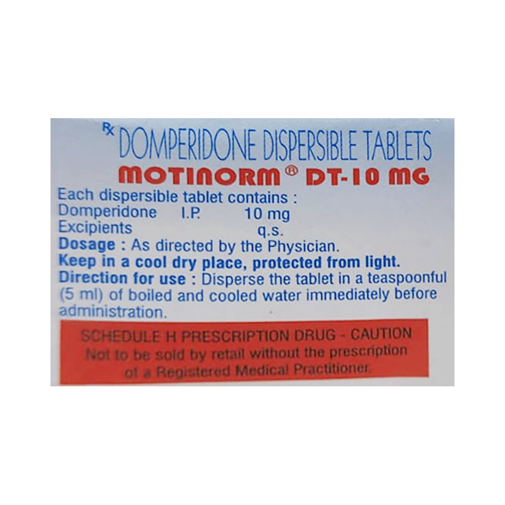 Montinorm DT 10 Tablet is used in the treatment of indigestion, nausea, and vomiting. It increases the movement of food through the stomach and intestines, thereby relieving bloating, fullness, and gastric discomfort. Take Montinorm DT 10 Tablet half an hour before each meal in the dose and duration as advised by the doctor. The dose you are given will depend on your condition and how you respond to the medicine. You should take this medicine until your doctor tells you to stop. Let your doctor know about all other medications you are taking as some may affect, or be affected by this medicine.The most common side effects are headache, dry mouth, and stomach pain. Most of these are temporary and usually resolve with time. Contact your doctor straight away if you are at all concerned about any of these side effects. It may also cause dizziness. Do not drive or do anything that requires mental focus until you know how this medicine affects you. Avoid drinking alcohol while taking this medicine as it can worsen the side effects. This medicine may also cause diarrhea, so it is better to take plenty of fluids while taking this medicine as it may help to prevent dehydration.Before taking this medicine you should let your doctor know if you have liver or kidney problems. You shouldn't take it at the same time as an antacid. Pregnant women should also consult their doctor. You should avoid this medicine if suffering from bleeding ulcers in the stomach.