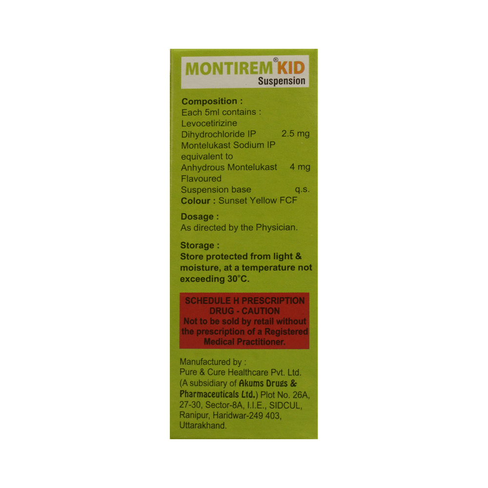 Montirem Kid Oral Suspension is commonly prescribed in children to treat symptoms of allergy such as runny nose, sneezing, itching, swelling, congestion, and watery eyes. It may also help in the treatment of asthma and skin allergies. Give this medicine to your child at a fixed time before or after food in the prescribed dose, time, and way. For asthma, prefer giving Montirem Kid Oral Suspension in the evening or 2 hours before physical activity. For allergy, it is best to give it either in the morning or in the evening, depending upon the time of onset of symptoms. In case your child has both, prefer giving it in the evening. If your child vomits within 30 minutes of taking this medicine, give the same dose again, but skip it if it’s already time for the next dose.Your child may start to feel better after a few regular doses. However, you must still complete the prescribed dose to ensure maximum benefit. Moreover, stopping the medicine abruptly may worsen your child’s condition. This medicine may cause some minor and temporary side effects like vomiting, diarrhea, nausea, dizziness, dry mouth, rash, and headache. Usually, these episodes subside once your child’s body adapts to the medicine. However, in case these effects persist or start bothering your child, consult your child’s doctor without any delay.Let your child’s doctor know if your child is already taking any medicines. Also, narrate your child’s complete medical history, including any prior episodes of allergy, heart problem, blood disorder, vascular disorders, birth defects, airway obstruction, lung anomaly, skin disorder, liver impairment, and kidney malfunction. This information is critical for dose alterations and in planning your child’s overall treatment.