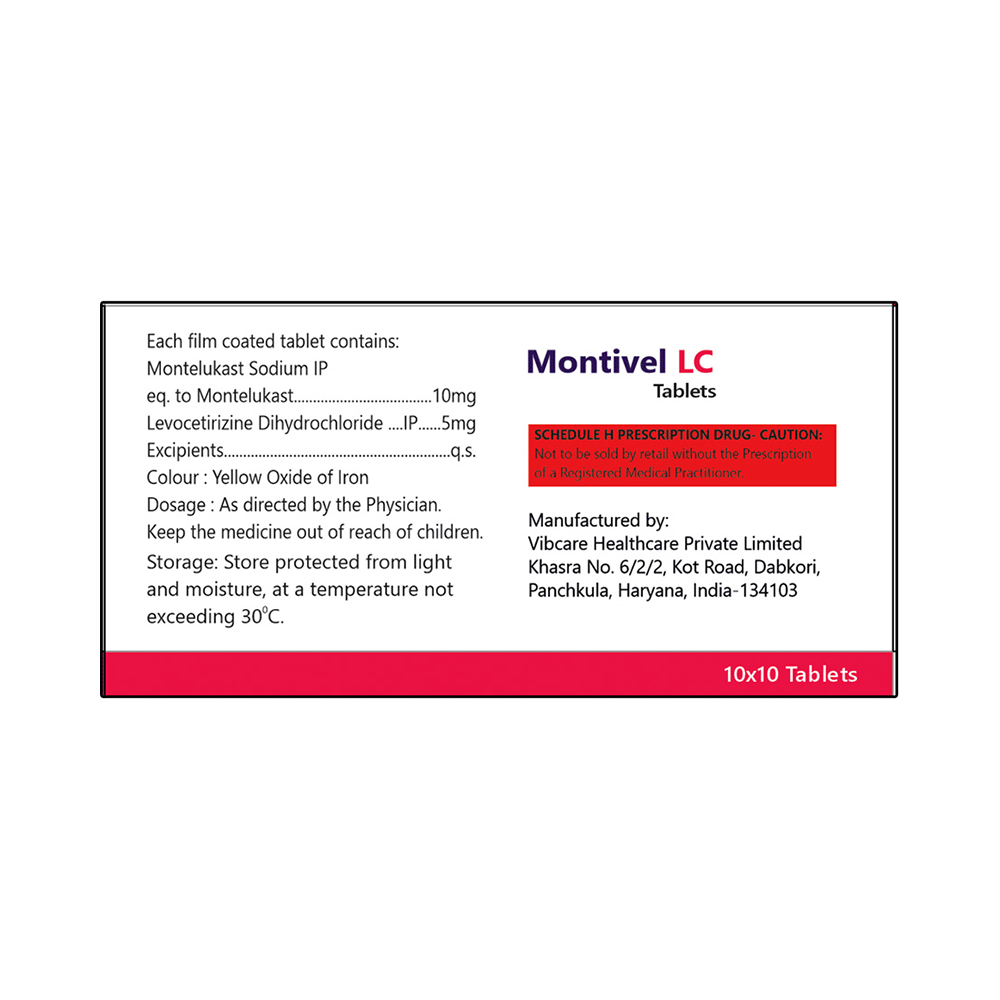 Montivel LC Tablet is a combination medicine used in the treatment of allergic symptoms such as runny nose, stuffy nose, sneezing, itching, swelling, watery eyes and congestion or stuffiness. It also reduces inflammation in the airways and make breathing easier. Montivel LC Tablet is taken with or without food in a dose and duration as advised by the doctor. The dose you are given will depend on your condition and how you respond to the medicine. You should keep taking this medicine for as long as your doctor recommends. If you stop treatment too early your symptoms may come back and your condition may worsen. Let your healthcare team know about all other medications you are taking as some may affect, or be affected by this medicine.The most common side effects are nausea, diarrhea, vomiting, dryness in the mouth, headache, skin rash, flu-like symptoms, and fatigue. Most of these are temporary and usually resolve with time. Contact your doctor straight away if you are at all concerned about any of these side effects. This medicine may cause dizziness and sleepiness, so do not drive or do anything that requires mental focus until you know how this medicine affects you. Avoid drinking alcohol while taking this medicine as it can worsen your sleepiness.Never support self-medication or recommend your medicine to another person. It is beneficial to have plenty of fluids while taking this medication. Before you start taking this medicine it is important to inform your doctor if you are suffering from kidney disease.