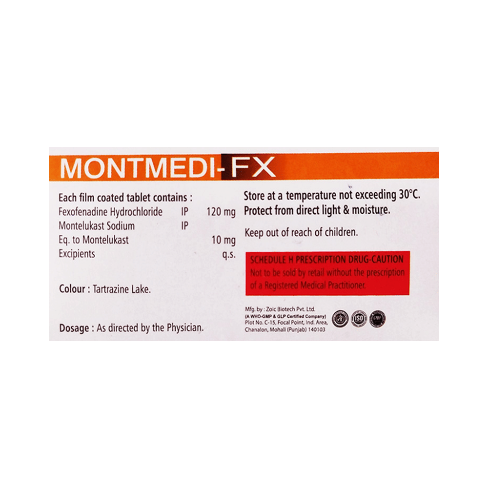 Montmedi-FX Tablet is a combination medicine used in the treatment of allergy symptoms such as runny nose, stuffy nose, sneezing, watery eyes, and congestion or stuffiness. Montmedi-FX Tablet is taken with or without food in a dose and duration as advised by the doctor. The dose you are given will depend on your condition and how you respond to the medicine. You should keep taking this medicine for as long as your doctor recommends. If you stop treatment too early your symptoms may come back and your condition may worsen. Let your healthcare team know about all other medications you are taking as some may affect, or be affected by this medicine.The most common side effects include nausea, diarrhea, vomiting, skin rash, flu-like symptoms, and headache. Most of these are temporary and usually resolve with time. Contact your doctor straight away if you are at all concerned about any of these side effects. This medicine may cause dizziness and sleepiness, so do not drive or do anything that requires mental focus until you know how this medicine affects you. Avoid drinking alcohol while taking this medicine as it can worsen your sleepiness.Never support self-medication or recommend your medicine to another person. It is beneficial to have plenty of fluids while taking this medication. Before you start taking this medicine it is important to inform your doctor if you are suffering from liver or kidney disease. You should also tell your doctor if you are pregnant, planning pregnancy or breastfeeding.
