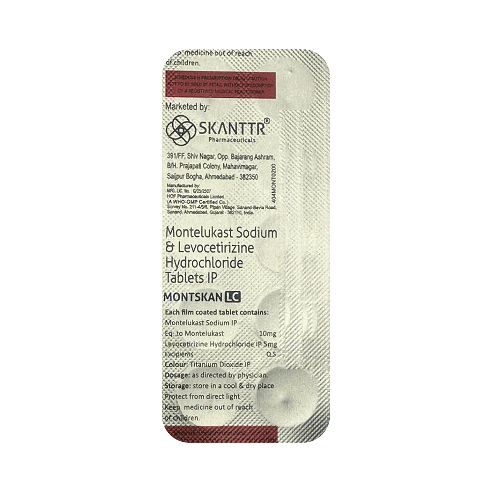 Montskan LC Tablet is a combination medicine used in the treatment of allergic symptoms such as runny nose, stuffy nose, sneezing, itching, swelling, watery eyes and congestion or stuffiness. It also reduces inflammation in the airways and make breathing easier. Montskan LC Tablet is taken with or without food in a dose and duration as advised by the doctor. The dose you are given will depend on your condition and how you respond to the medicine. You should keep taking this medicine for as long as your doctor recommends. If you stop treatment too early your symptoms may come back and your condition may worsen. Let your healthcare team know about all other medications you are taking as some may affect, or be affected by this medicine.The most common side effects are nausea, diarrhea, vomiting, dryness in the mouth, headache, skin rash, flu-like symptoms, and fatigue. Most of these are temporary and usually resolve with time. Contact your doctor straight away if you are at all concerned about any of these side effects. This medicine may cause dizziness and sleepiness, so do not drive or do anything that requires mental focus until you know how this medicine affects you. Avoid drinking alcohol while taking this medicine as it can worsen your sleepiness.Never support self-medication or recommend your medicine to another person. It is beneficial to have plenty of fluids while taking this medication. Before you start taking this medicine it is important to inform your doctor if you are suffering from kidney disease.