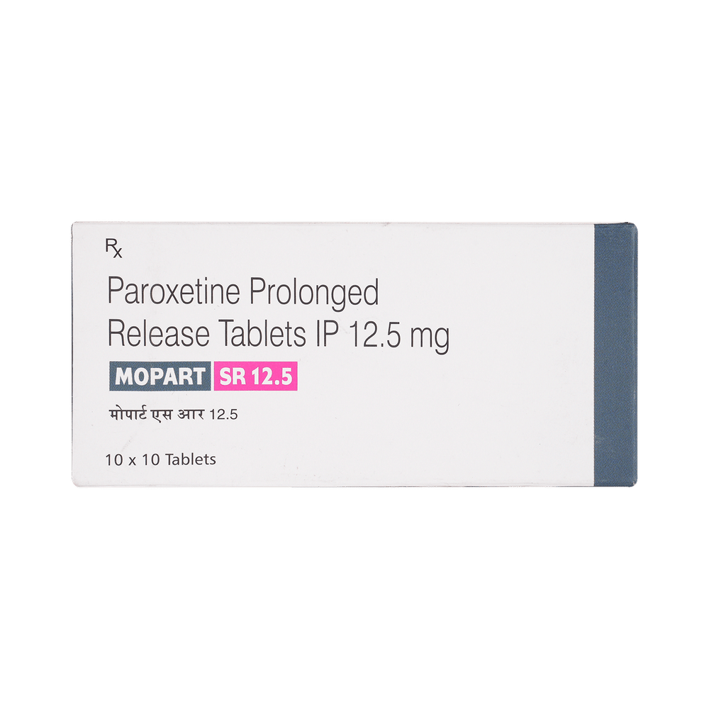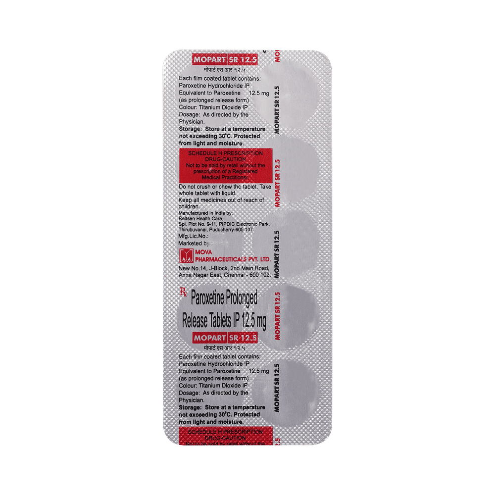 Mopart SR 12.5 Tablet is a type of antidepressant belonging to the selective serotonin reuptake inhibitor (SSRI) group of medicines. It is widely prescribed to treat depression and anxiety-related conditions like obsessive-compulsive disorder, and panic disorder. Mopart SR 12.5 Tablet helps many people to recover from depression by improving their mood and relieving anxiety and tension. It can be taken with or without food. The dose and how often you need it will be decided by your doctor so that you get the right amount to control your symptoms.Your doctor may start you on a lower dose and increase it gradually. Do not change the dose or stop taking it without talking to your doctor, even if you feel well. Doing so may make your condition worse or you may suffer from unpleasant withdrawal symptoms (anxiety, restlessness, palpitations, dizziness, sleep disturbances, etc).To get the most benefit, take this medicine regularly at the same time each day. Your doctor may advise you to take it in the morning if you have trouble sleeping. It may take a few weeks before you start feeling better. Let your doctor know if you do not see any improvement even after 4 weeks.Some common side effects of Mopart SR 12.5 Tablet include nausea, fatigue, dry mouth, loss of appetite, increased sweating, dizziness, nervousness, tremors, insomnia (difficulty in sleeping), and constipation. Sexual side effects like decreased sexual drive, delayed ejaculation, and erectile dysfunction may also be seen. Let your doctor know straight away if you develop any sudden worsening of mood or any thoughts about harming yourself.Before taking this medicine, you should tell your doctor if you have epilepsy (seizure disorder or fits), diabetes, liver or kidney disease, heart problems, or glaucoma. These may affect your treatment. Pregnant or breastfeeding women should also consult their doctor before taking it. Some other medicines may affect the way it works, especially other antidepressants and medicines called MAO inhibitors. Please tell your doctor about all the medicines you are taking to make sure you are safe.