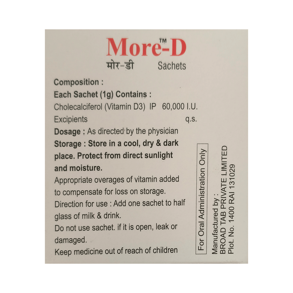More-D Sachet Orange Sugar Free is used in the treatment of vitamin D deficiency and osteoporosis. It helps the body to absorb calcium. Calcium is essential for maintaining strong and healthy bones. It is used when your diet does not provide enough calcium. More-D Sachet Orange Sugar Free should be taken as directed by your doctor. It is best taken with or after food, as this helps your body absorb it, and you should take it regularly to get the most benefits. If you are using it to treat osteoporosis, you will also be prescribed other medicines. This medicine may be only part of a complete treatment program that includes making changes to your diet and taking calcium and vitamin supplements. Learn about the foods you should eat to ensure you get enough calcium and vitamin D.More-D Sachet Orange Sugar Free has few side effects, and none are common. If you take too much, you may feel weakness, muscle pain, or a metallic taste in your mouth. If you experience any such side effects, speak with your doctor. They may be able to help you reduce or treat the symptoms.Before taking this medicine, tell your doctor if you have high calcium levels in your blood or if you have any heart, kidney, or liver disease. Some other medicines can decrease the absorption of vitamin D3, so let your doctor know about all the other medicines you are taking to make sure you are safe. This medicine may help during pregnancy when your body needs more vitamin D, but too much could harm your baby. Discuss it with your doctor.
