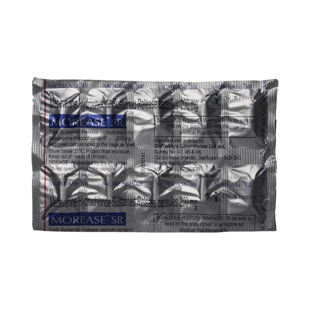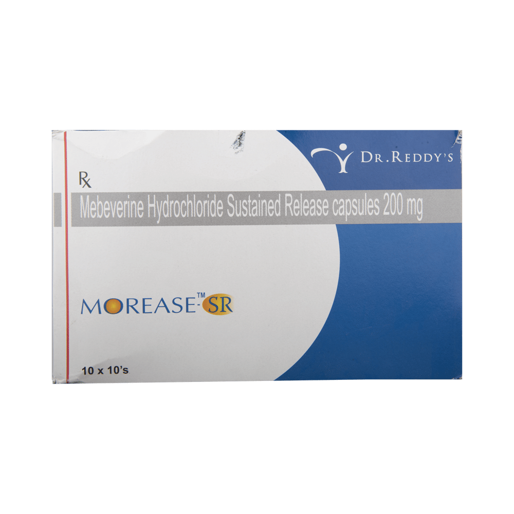 Morease- SR Capsule is a prescription medicine used to treat and relieve symptoms of irritable bowel syndrome such as stomach pain and spasm, cramps in the abdomen, gas, bloating, and changes in bowel habits. This medicine relaxes muscles of the intestine and relieves spasms. Morease- SR Capsule should be taken in a dose and duration as advised by your doctor. It is swallowed whole with a drink of water preferably 20 minutes before a meal to relieve or reduce post-meal symptoms. Let your doctor know about all other medications you are taking as some may affect, or be affected by this medicine. You should keep taking this medicine for as long as your doctor recommends. If you stop treatment too early your symptoms may come back and your condition may worsen. Remember following lifestyle modifications like having a fiber-rich diet, increase fluid intake and regular exercise can help you to get better results.This medicine has very less or minimal side effects but it may cause skin rash, fainting, or angioedema sometimes. Be cautious as it is important to stop the medication and inform the doctor if you encounter difficulty in breathing or swelling of the face, neck, tongue, or throat.Before taking this medicine, you should let your doctor know if you have liver and kidney problems. Pregnant or breastfeeding women should also consult their doctor before taking this medicine.