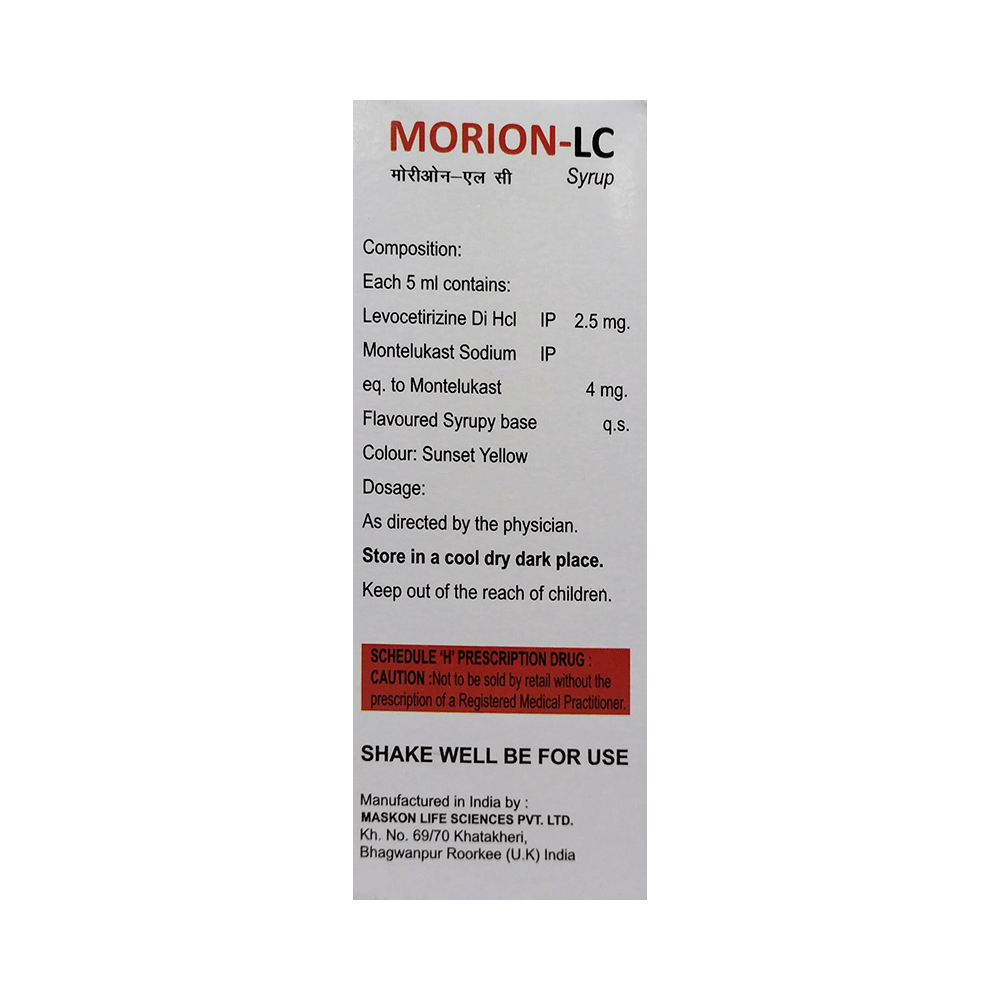 In Treatment of Allergic skin conditionsMorion-LC Syrup is effective in treating allergic skin conditions with inflammation and itching. It reduces the actions of chemicals in the body that cause inflammation of the skin. When used correctly it is a safe and effective treatment. It reduces the redness, rash, pain or itchiness caused by your skin’s reaction to an irritant. It thus improves your self-esteem and confidence as your appearance changes. Keep taking it for as long as it is prescribed to get the full benefits.In Treatment of Sneezing and runny nose due to allergiesMorion-LC Syrup is a combination medicine that provides relief from symptoms such as blocked or runny nose, sneezing and itchy or watery eyes. This will make it easier for you to go about your daily activities. It rarely has any serious side effects and you may only need to take it on days you have symptoms. If you are taking it to prevent getting symptoms you should use it regularly to get the most benefit.In Treatment of Hay feverHay fever, also called allergic rhinitis, causes cold-like signs and symptoms, such as a runny nose, itchy eyes, congestion, sneezing and sinus pressure. The only difference is that in hay fever, these symptoms are not produced due to a virus but are simply allergic responses of our body to allergens (allergy causing agents such as pollen). Morion-LC Syrup is used to provide relief from these symptoms of hay fever. It works by blocking the release of the chemical substance responsible for producing such allergy symptoms. Morion-LC Syrup is a safe medicine which helps treat hay fever and makes us feel at ease.show moreshow less