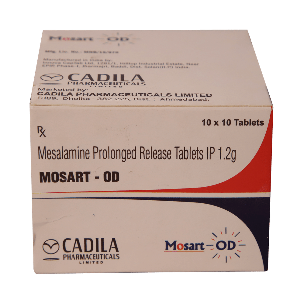 Mosart-OD Tablet is an anti-inflammatory medicine used to treat a type of bowel disease known as ulcerative colitis. It helps to reduce symptoms such as diarrhea, bleeding and stomach pain by reducing inflammation in the bowel. Mosart-OD Tablet may also be used to treat another type of bowel disease known as Crohn’s ileocolitis. It should be taken with food. The dose will depend on what you are being treated for but take it exactly as your doctor prescribes. You should keep taking this medicine for as long as your doctor recommends. If you stop treatment too early your symptoms may come back and your condition may worsen.The most common side effects of this medicine include nausea, diarrhea, stomach pain, headache, itching, flatulence, and vomiting. If these symptoms bother you, do not go away, or get worse, let your doctor know. There may be ways of reducing or preventing them. Some people may get a severe allergic reaction that needs urgent medical attention. Contact your doctor immediately if you notice symptoms like swelling of the face, tongue, throat, or lips, unusual bleeding, bruising, rash, fever, sore throat, or excessive tiredness. Before taking it, tell your doctor if you have any kidney or liver problems or a blockage in your stomach. Your age may also be a factor in deciding whether this medicine is suitable. Pregnant or breastfeeding women should also consult their doctor before taking this medicine. Let your doctor know about all other medications you are taking as some may affect, or be affected by this medicine.