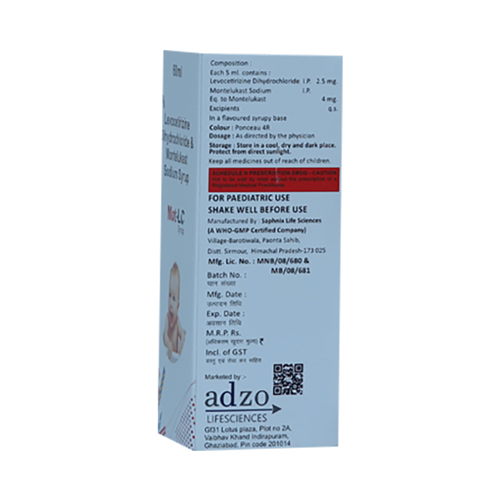 In Treatment of Allergic skin conditionsMot-LC Syrup is effective in treating allergic skin conditions with inflammation and itching. It reduces the actions of chemicals in the body that cause inflammation of the skin. When used correctly it is a safe and effective treatment. It reduces the redness, rash, pain or itchiness caused by your skin’s reaction to an irritant. It thus improves your self-esteem and confidence as your appearance changes. Keep taking it for as long as it is prescribed to get the full benefits.In Treatment of Sneezing and runny nose due to allergiesMot-LC Syrup is a combination medicine that provides relief from symptoms such as blocked or runny nose, sneezing and itchy or watery eyes. This will make it easier for you to go about your daily activities. It rarely has any serious side effects and you may only need to take it on days you have symptoms. If you are taking it to prevent getting symptoms you should use it regularly to get the most benefit.In Treatment of Hay feverHay fever, also called allergic rhinitis, causes cold-like signs and symptoms, such as a runny nose, itchy eyes, congestion, sneezing and sinus pressure. The only difference is that in hay fever, these symptoms are not produced due to a virus but are simply allergic responses of our body to allergens (allergy causing agents such as pollen). Mot-LC Syrup is used to provide relief from these symptoms of hay fever. It works by blocking the release of the chemical substance responsible for producing such allergy symptoms. Mot-LC Syrup is a safe medicine which helps treat hay fever and makes us feel at ease.show moreshow less