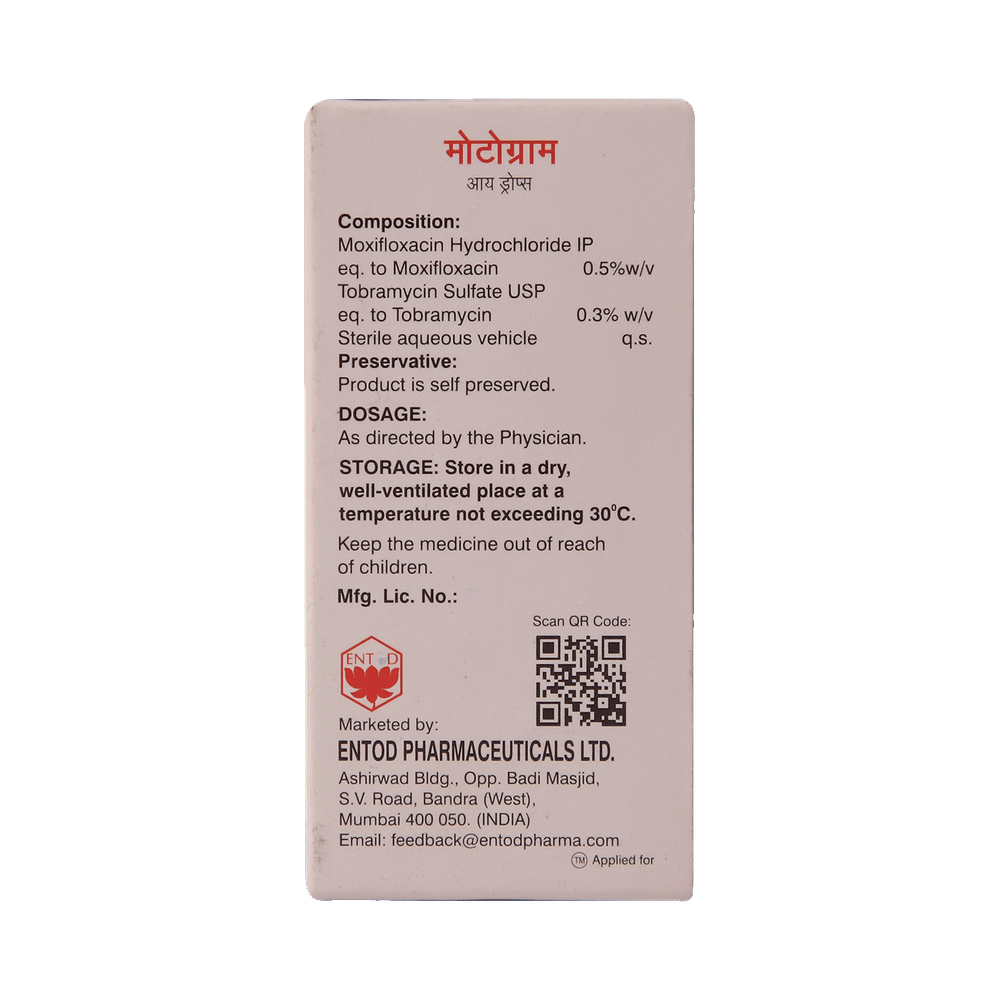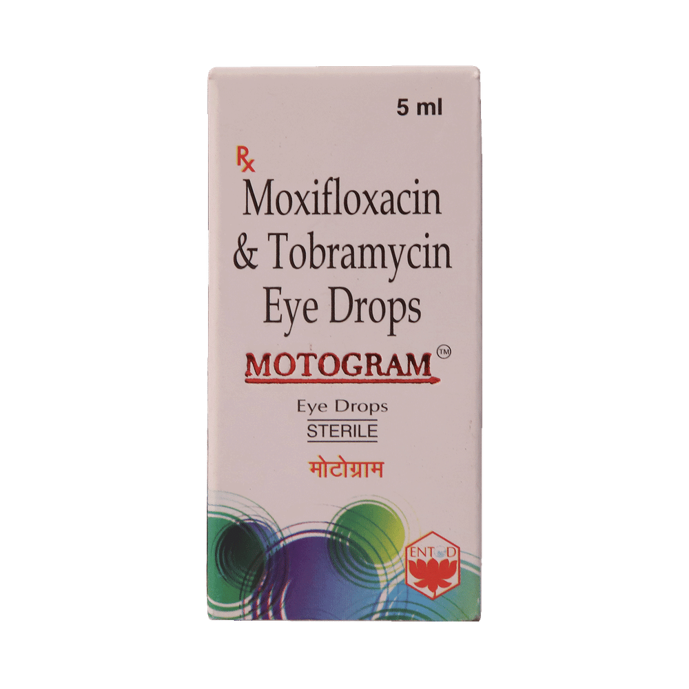 Motogram Eye Drop is a medicine used to treat bacterial eye infections. It kills and prevents the growth of infection-causing bacteria. This way it relieves the symptoms and speeds up the healing process. Motogram Eye Drop is to be used only in the affected eye. Read the label carefully for instruction before you use the medicine. Use it in the exact dose and duration as advised by the doctor or as instructed in the label. Wash your hands before using this medicine. Complete your dose even if you feel better. Stopping the medicine too early may bring back the infection.Use of this medicine may cause burning, irritation, itching, and redness at the site of application. These are usually temporary and resolve with time. However, if they persist or get worse, inform your doctor. In case of accidental contact with your ears, nose, or mouth, immediately rinse it with water.Inform your doctor if you have a known allergy to any of the ingredients in this medicine or if you are taking any other medication. It is advised not to drive or operate heavy machinery immediately after using this medicine as it may cause temporary blurring of vision and may affect your ability to drive.