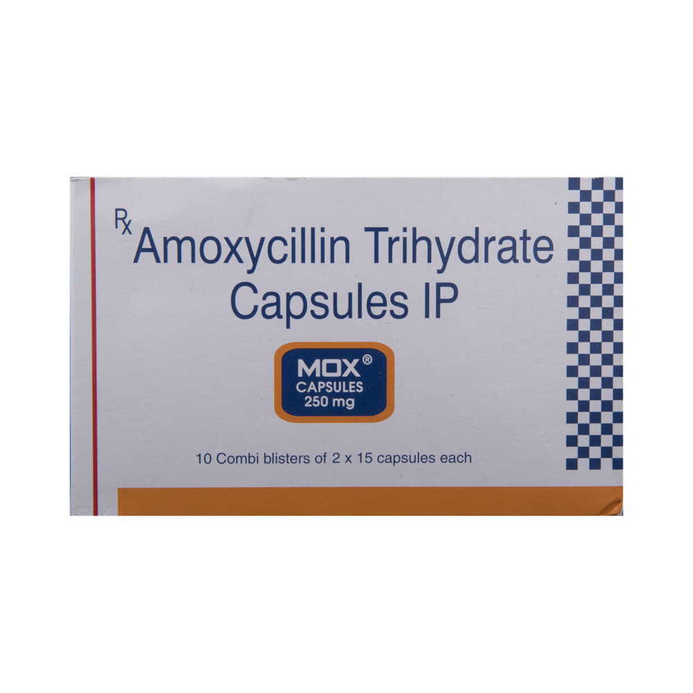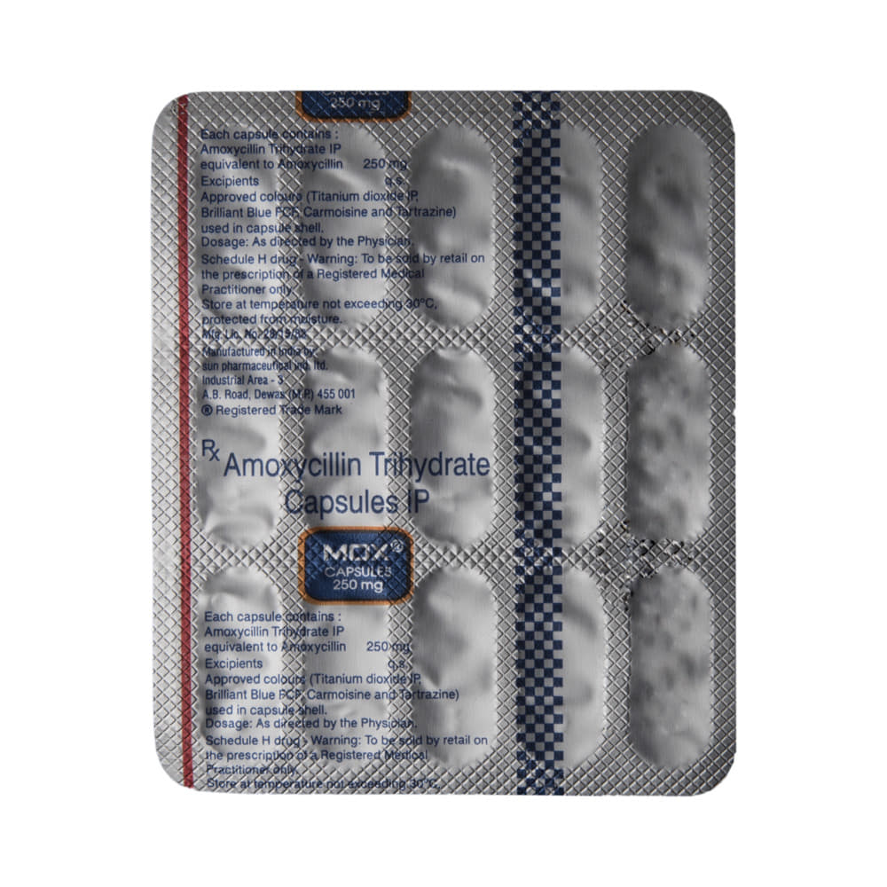 Mox 250mg Capsule is used to treat a variety of bacterial infections. It is effective in infections of the throat, ear, nasal sinuses, respiratory tract (e.g., pneumonia), urinary tract, skin and soft tissue, and typhoid fever. Additionally, Mox 250mg Capsule helps to eliminate a bacteria known as H. pylori in people with peptic ulcer disease. It is a broad-spectrum antibiotic that fights and stops the growth of many types of bacteria. This medicine is best taken with a meal to reduce the chance of a stomach upset. You should take it regularly at evenly spaced intervals as per the schedule prescribed by your doctor. Taking it at the same time every day will help you to remember to take it.Do not skip any doses and finish the full course of treatment even if you feel better. Stopping the medicine too early may lead to the infection returning or worsening. The total duration of treatment and precise dosage will be decided by your doctor, depending on the type of infection that you have and how well you respond to the medication.Before taking this medicine, inform your doctor if you are allergic to penicillin or any penicillin-type of medicine. Rash, vomiting, allergic reactions, nausea, and diarrhea may be seen as side effects in some patients. These are temporary and usually resolve quickly. Consult your doctor if any of these side effects persist or if your condition worsens. This medicine is generally regarded as safe to use during pregnancy if used under a doctor’s supervision.