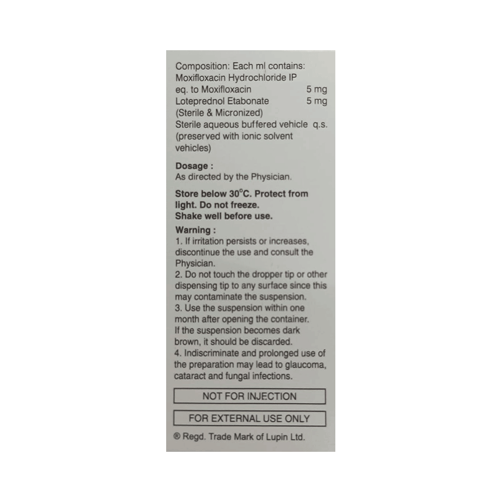 Moxiblu LX Eye Drop is a prescription medicine used to treat eye infection with inflammation. It kills and stops the growth of bacteria and helps in relieving symptoms such as redness, itching, and swelling. Moxiblu LX Eye Drop is to be used only in the affected eye. Read the label carefully for instruction before you use the medicine. Use it in the exact dose and duration as advised by the doctor or as instructed in the label. Wash your hands before using this medicine. Complete your dose even if you feel better. Stopping the medicine too early may bring back the infection.Use of this medicine may cause irritation and discomfort immediately on application. These are usually temporary and resolve with time. However, if they persist or get worse, inform your doctor. In case of accidental contact with your ears, nose, or mouth, immediately rinse it with water.Inform your doctor if you have a known allergy to any of the ingredients in this medicine or if you are taking any other medication. It is advised not to drive or operate heavy machinery immediately after using this medicine as it may cause temporary blurring of vision and may affect your ability to drive.