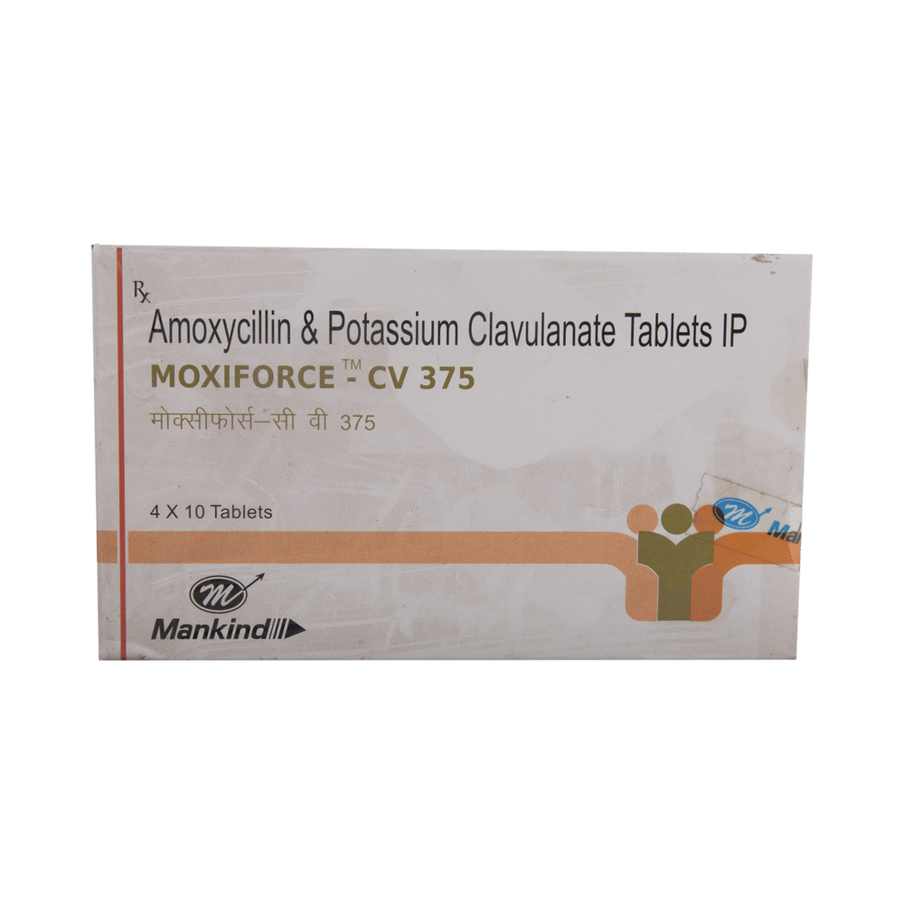 Moxiforce-CV 375 Tablet is a combination of two medicines: Amoxycillin and Clavulanic Acid. Amoxycillin is an antibiotic. It works by preventing the formation of the bacterial protective covering, which is essential for the survival of bacteria. Clavulanic Acid is a beta-lactamase inhibitor that reduces resistance and enhances the activity of Amoxycillin against bacteria.