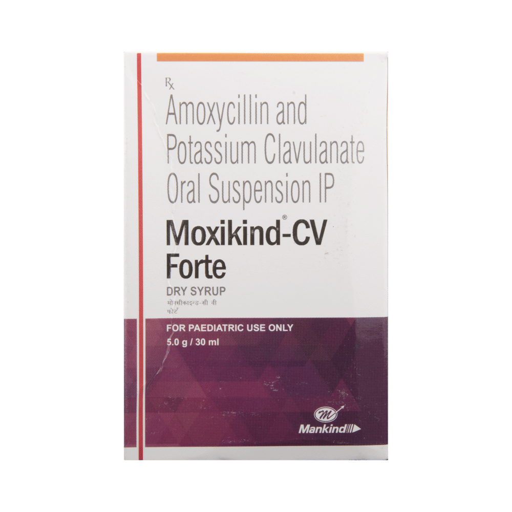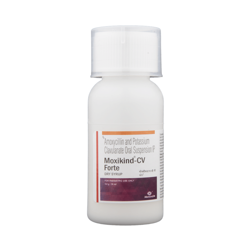 Moxikind-CV Forte Dry Syrup is an antibiotic medicine that helps treat bacterial infections of the ear, nose, throat, chest, lungs, teeth, skin, and urinary tract. It is capable of killing bacteria that have become resistant to other therapies and thus also helps treat tuberculosis that is resistant to other treatments. You can give Moxikind-CV Forte Dry Syrup to your child with or without food. It is better to give it with food as that helps increase absorption and decrease the risk of stomach upset. The doctor may prescribe giving it two to three times a day. Medicine dose depends on the severity of the infection, its type, and your child’s body weight and age. So, stick to the dose, time, and way prescribed. If your child vomits the medicine within 30 minutes of intake, let the child calm down and repeat the dose. Do not double dose if it's the time for the next dose.Moxikind-CV Forte Dry Syrup may cause vomiting, diarrhea, nausea, abdominal pain, and allergy. These side effects should diminish on their own. But, in case they persist or start bothering your child, you must not delay speaking to your child’s doctor.Share your child’s entire medical history with the doctor, including any previous episode of allergy, heart problem, blood disorder, birth defects, airway obstruction, lung anomaly, gastrointestinal problem, skin disorder, liver impairment, and kidney malfunction. This information will assist the doctor in making dose alterations and for planning your child’s overall treatment.
