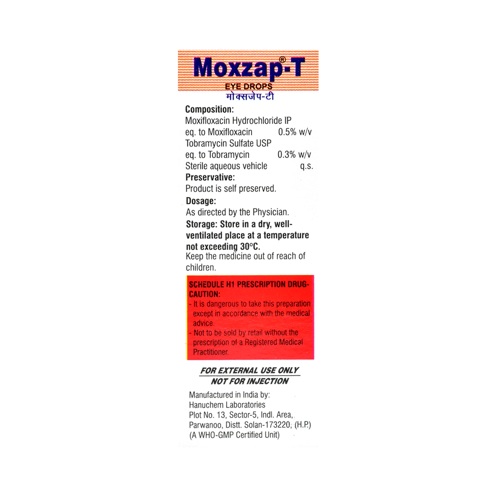 Moxzap-T Eye Drop is a medicine used to treat bacterial eye infections. It kills and prevents the growth of infection-causing bacteria. This way it relieves the symptoms and speeds up the healing process. Moxzap-T Eye Drop is to be used only in the affected eye. Read the label carefully for instruction before you use the medicine. Use it in the exact dose and duration as advised by the doctor or as instructed in the label. Wash your hands before using this medicine. Complete your dose even if you feel better. Stopping the medicine too early may bring back the infection.Use of this medicine may cause burning, irritation, itching, and redness at the site of application. These are usually temporary and resolve with time. However, if they persist or get worse, inform your doctor. In case of accidental contact with your ears, nose, or mouth, immediately rinse it with water.Inform your doctor if you have a known allergy to any of the ingredients in this medicine or if you are taking any other medication. It is advised not to drive or operate heavy machinery immediately after using this medicine as it may cause temporary blurring of vision and may affect your ability to drive.