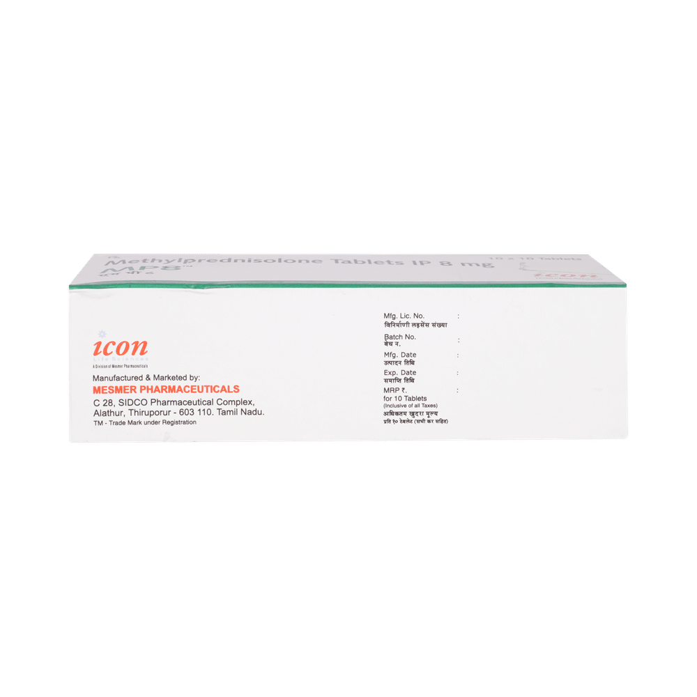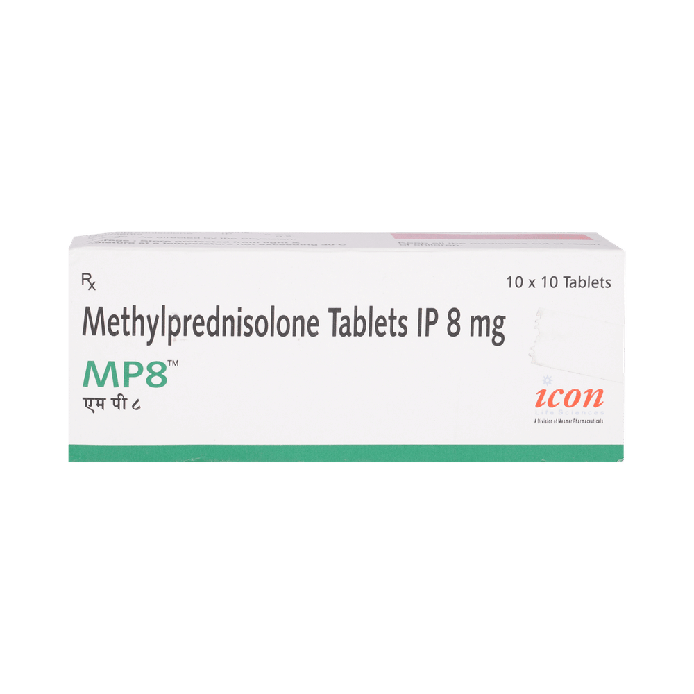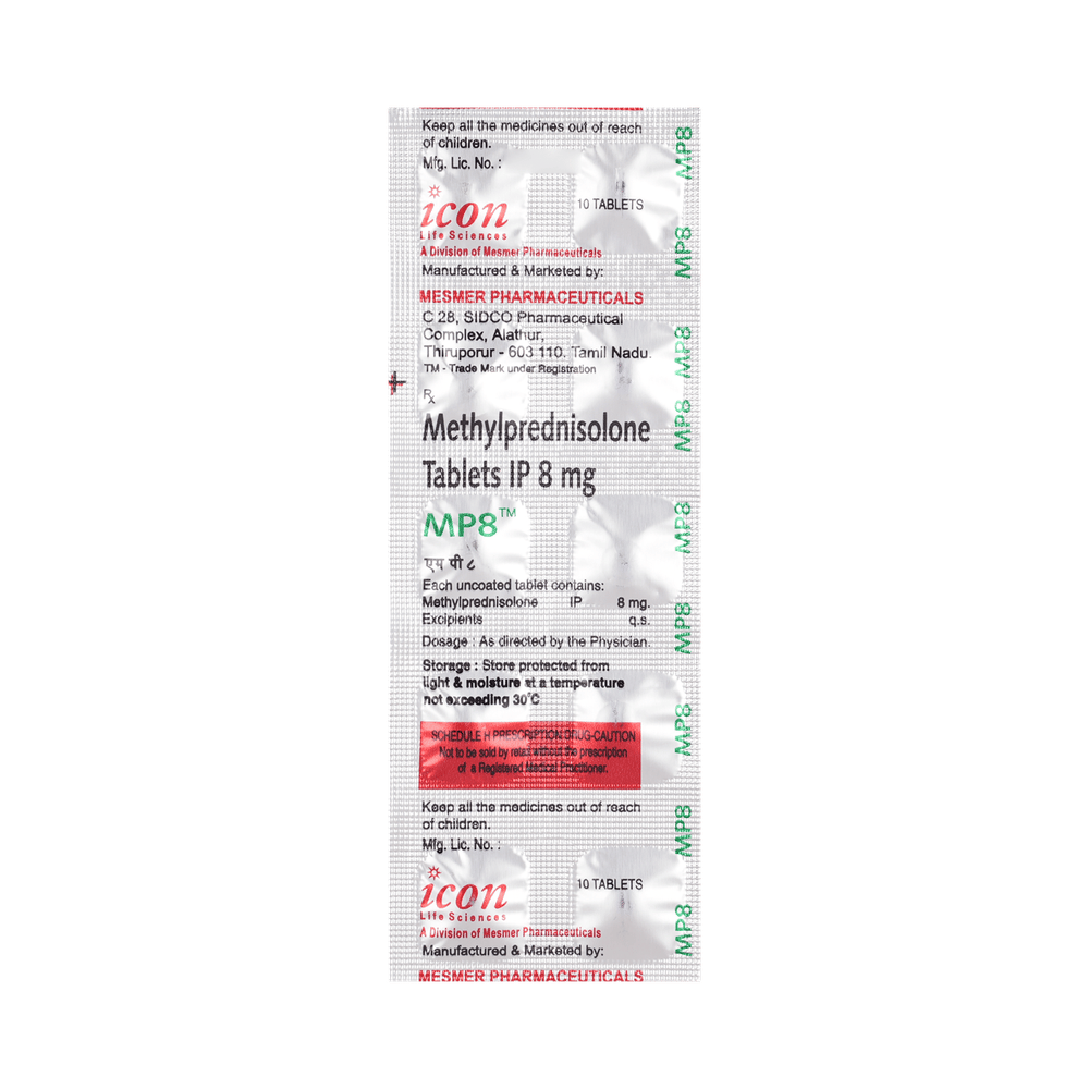 MP 8mg Tablet is a medicine used to treat a wide variety of medical conditions such as severe allergic conditions, asthma, rheumatic disorder, skin and eye disorders, and systemic lupus erythematosus. It provides relief by preventing the release of substances that cause inflammation. MP 8mg Tablet should be taken with food. This will prevent you from getting an upset stomach. The dose and duration will depend on what you are being treated for. You should always take the amount prescribed. Do not take a larger dose or use it more often. Keep taking it regularly even if you feel well. Some conditions will become worse if you stop using this medicine.The most common side effects of this medicine include skin thinning, increased risk of infection, reduction in bone density, and mood changes. If these side effects bother you or do not go away, your doctor may suggest ways of preventing or reducing them. The use of this medicine may lower your ability to fight infections so avoid being near people who might pass on infections such as measles, chickenpox, or flu.Before using this medicine, you should tell your doctor if you have brittle bones (osteoporosis), mood disorders, high blood pressure, or liver disease. Also, tell your doctor if you have diabetes, this medicine may increase blood glucose levels which can cause or worsen diabetes. Many other drugs may affect, or be affected by, this medicine so let your doctor know all other medicines you are using, to make sure it is safe. You should also tell your doctor if you are pregnant, planning pregnancy or breastfeeding.