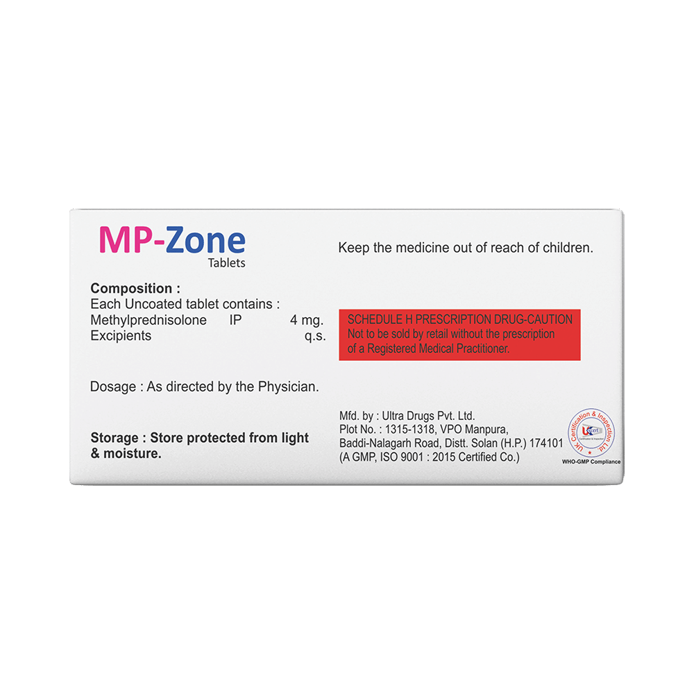 In Treatment of Allergic conditionsMP-Zone Tablet is used to treat different inflammatory and allergic conditions including arthritis, lupus, psoriasis, ulcerative colitis which affect the skin, blood, eyes, lungs, stomach, and nervous system. It works by lowering your immune system’s response to these conditions thereby reducing symptoms such as swelling, pain, itching and other allergic-type reactions.This medicine is given orally (by mouth). You should always take it as it has been prescribed for you. Do not stop taking it without your doctor’s advice. This can cause unpleasant withdrawal symptoms. Because this medicine weakens your immune system, you should avoid being near people who are ill or have infections.In Treatment of Systemic lupus erythematosus (SLE)Systemic lupus erythematosus (SLE) is an autoimmune disease. In this disease, the immune system of the body mistakenly attacks healthy tissue. It can affect the skin, joints, kidneys, brain, and other organs. MP-Zone Tablet prevents the release of substances in the body that cause inflammation. It lowers your immune system’s response and reduces symptoms such as swelling, pain, itching and other allergic-type reactions.In Treatment of Skin disordersMP-Zone Tablet prevents the release of substances in the body that cause inflammation. It can be used to treat different inflammatory and allergic conditions of the skin such as eczema and psoriasis. It works by lowering your immune system’s response to these conditions thereby relieving symptoms such as swelling, pain, itching and other allergic-type reactions.In Treatment of Eye disordersMP-Zone Tablet helps relieve symptoms of eye infections such as redness, swelling, itching and watering of eyes. This medicine works by decreasing the production of certain chemicals that cause inflammation of the eyes. This will make it easier for you to go about your daily activities. Use it as prescribed to get the most benefit. If you see no improvement even after a week, talk to your doctor.In Treatment of Rheumatic disorderRheumatic disorder is an autoimmune condition where your body’s immune system (which usually fights bacteria and viruses) attacks your body’s own cells. MP-Zone Tablet stops that from happening and can relieve the symptoms of this condition such as pain, swelling, and stiffness in your joints. It can also slow down joint damage, reduce disability, and enable you to be as active for as long as possible. It can take several weeks or months to notice the effect of the medicine. You should continue taking it until your doctor says it is okay to stop using the medicine.show moreshow less