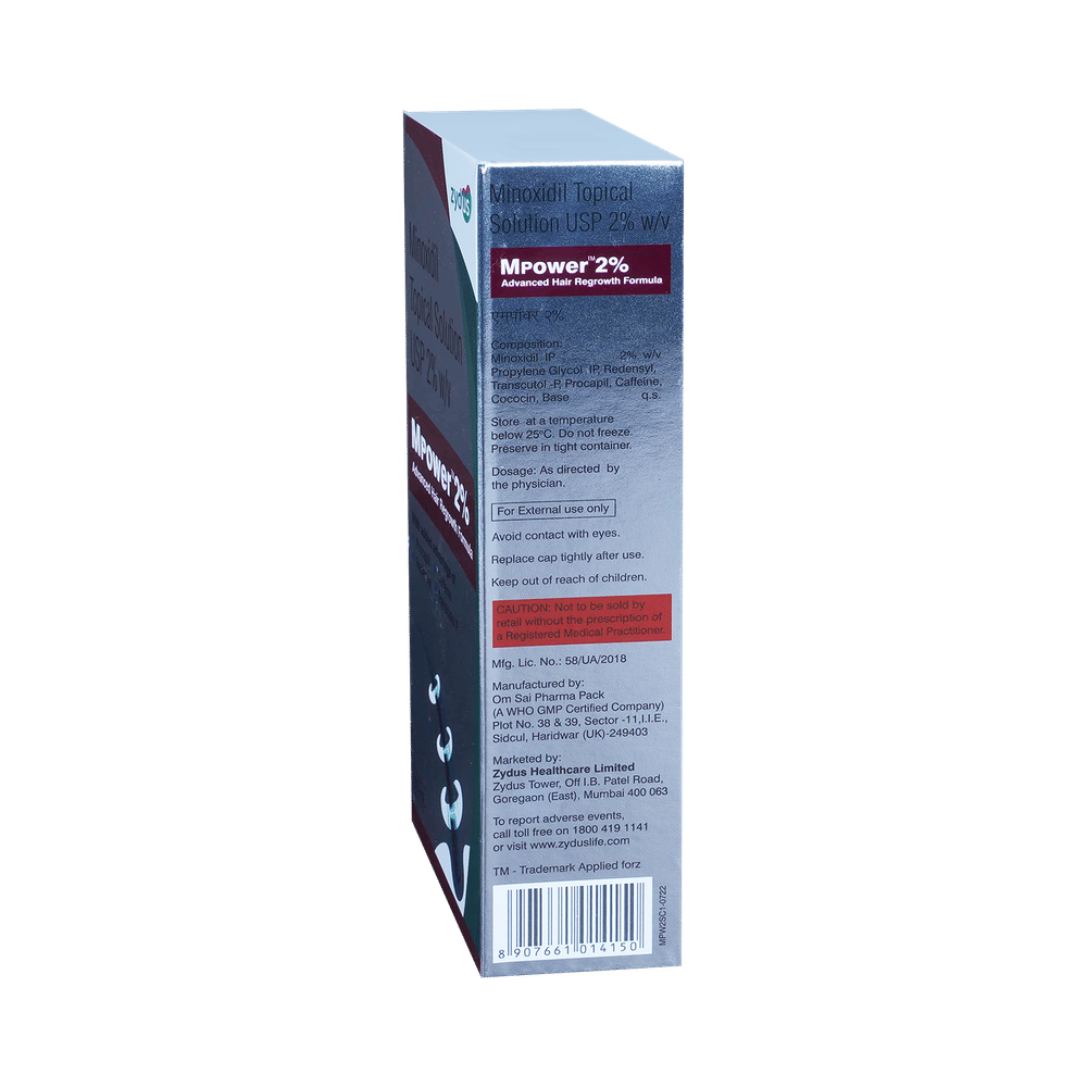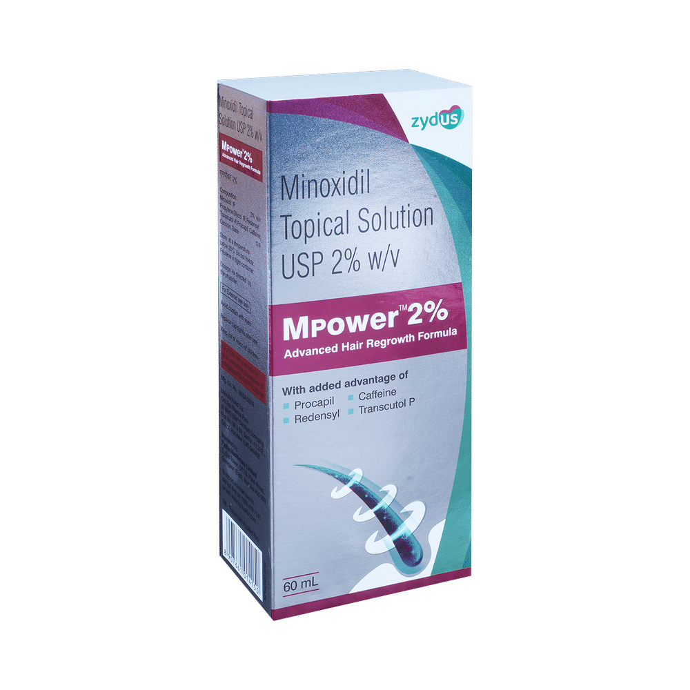 Mpower 2% Solution belongs to a class of drugs known as vasodilators. It is used to promote hair growth in men with male pattern baldness by improving blood flow to hair follicles, helping slow hair loss, and encouraging new hair growth when used regularly. Mpower 2% Solution should only be applied directly to the scalp area in the amount and in the way specified on the label or by your doctor. Clean and dry your scalp before using it. It may take approximately 2- 4 months to notice any hair growth. The first growth may be soft, colourless, and barely visible. Using more than recommended will not speed up hair growth and may increase the likelihood of side effects. This medication must be used continuously to maintain hair growth. Tell your doctor if your condition does not improve or worsen after using it for 4 to 6 months.The most common side effects of this medicine include itching, excessive hair growth, rash, and dermatitis. In case of accidental application in other areas, it may result in unwanted hair growth. Rinse thoroughly with plenty of water if you get it in your eyes, mouth, or broken skin. Talk to your doctor if you are bothered by the side effects or if they do not go away.People under 18 or over 65 should not usually use Mpower 2% Solution. It may also not be appropriate if your hair loss is due to medications (such as chemotherapy) or any nutritional deficiency. You should also not use this medicine if you have high blood pressure or use other creams or lotions to treat other scalp conditions. Talk to your doctor if you have heart disease or blood circulation problems.